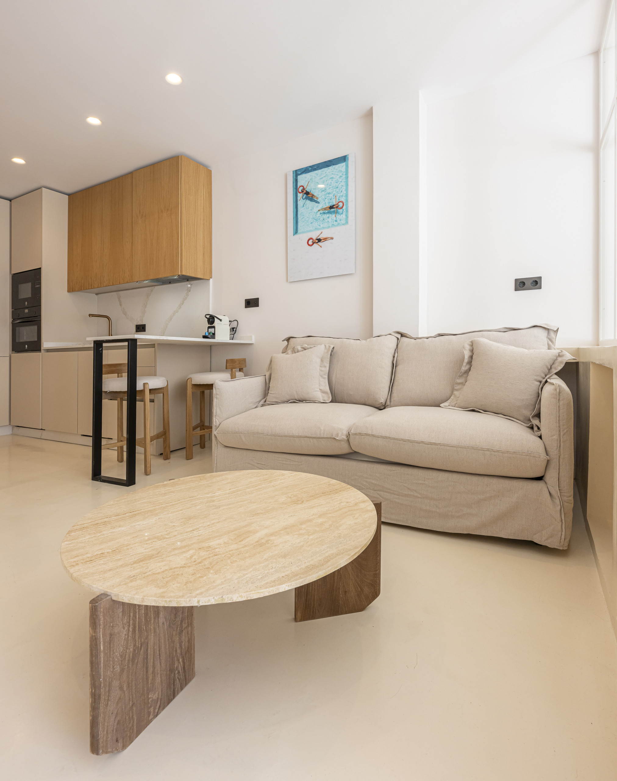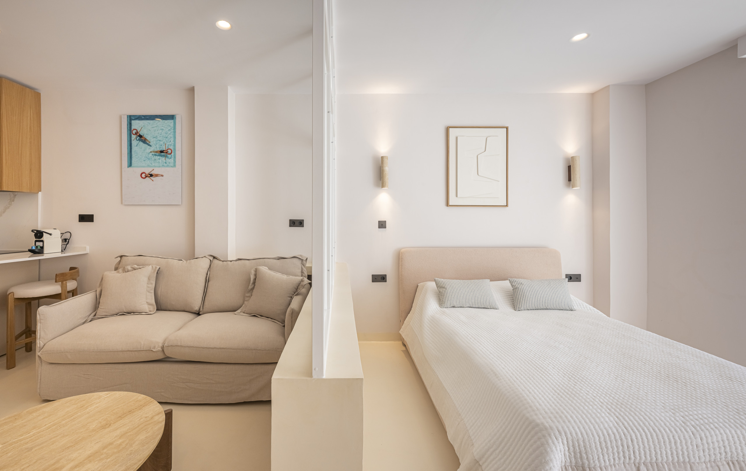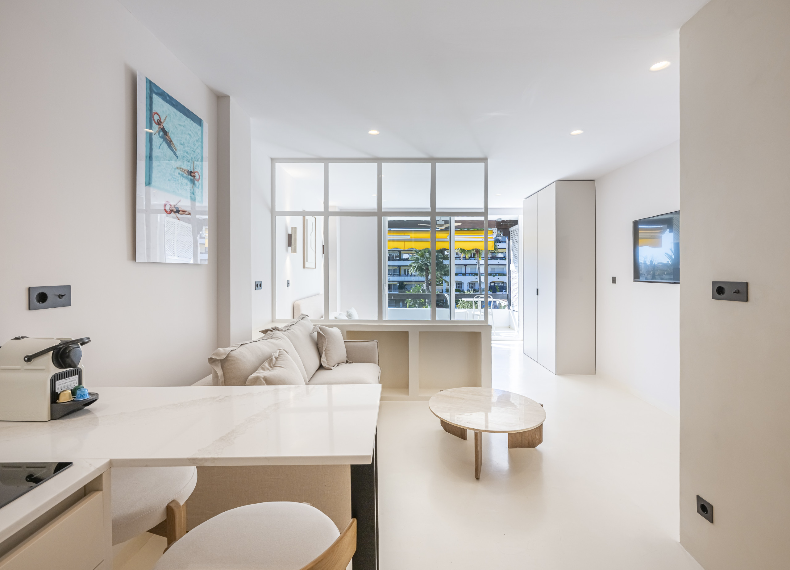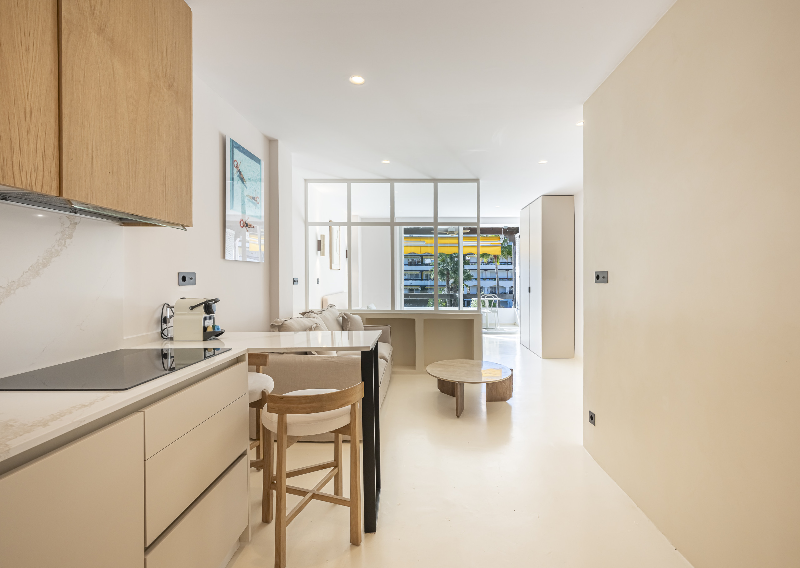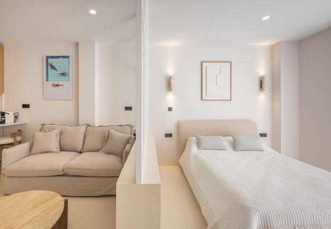 A flirtatious studio in Nueva Andalucía (Aries Street) is the perfect refuge for families, combining a modern open-concept design with exceptional warmth. With capacity for 4 people, the space stands out for its luminosity and Nordic and Mediterranean aesthetic, with finishes in cream tones and wood that invite relaxation.