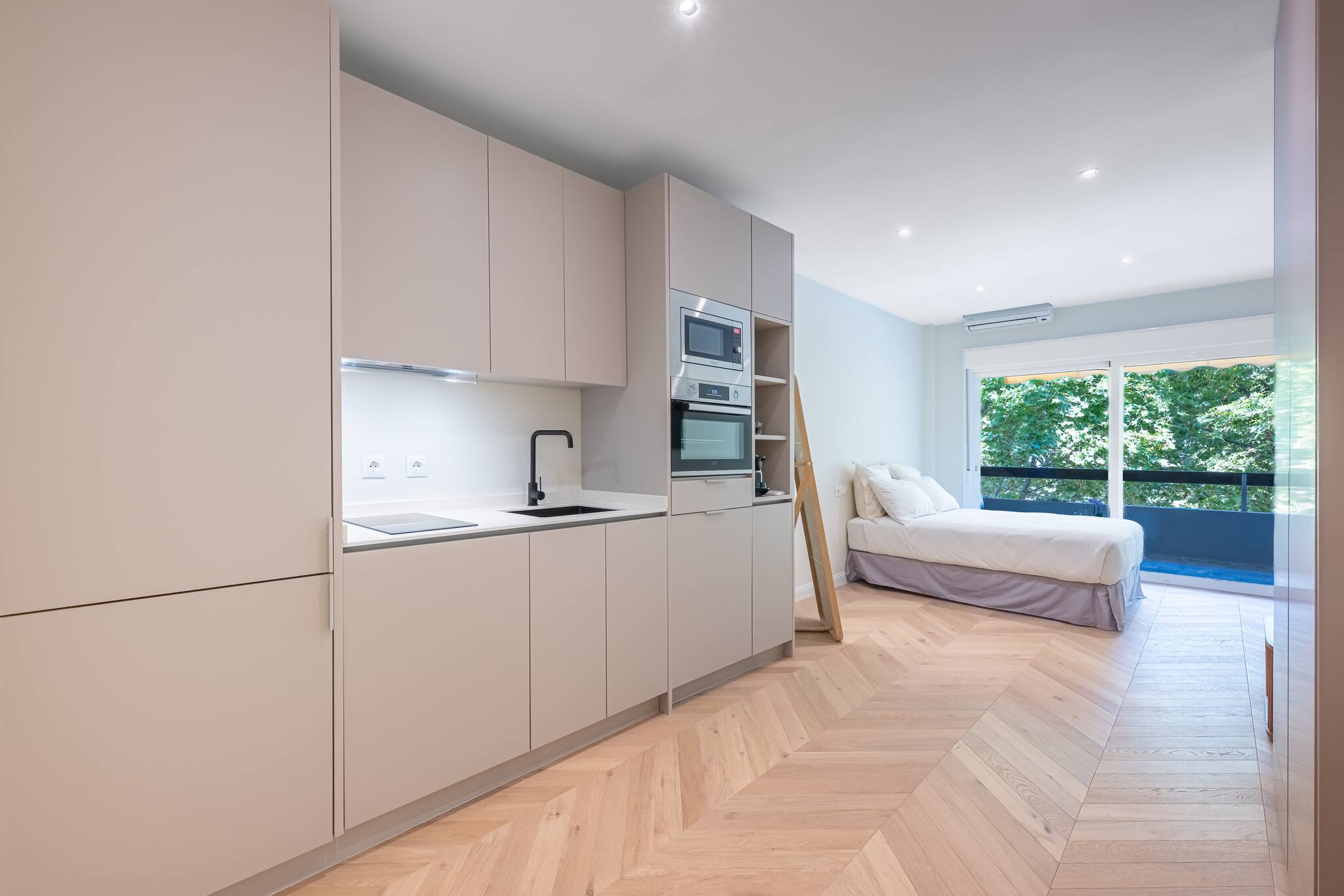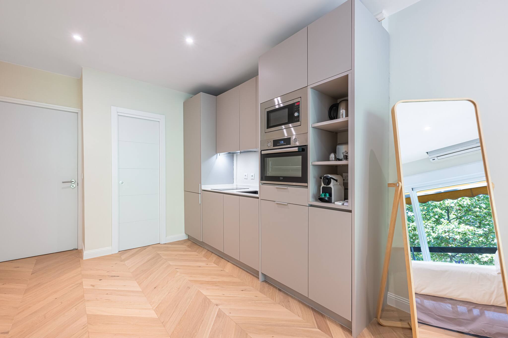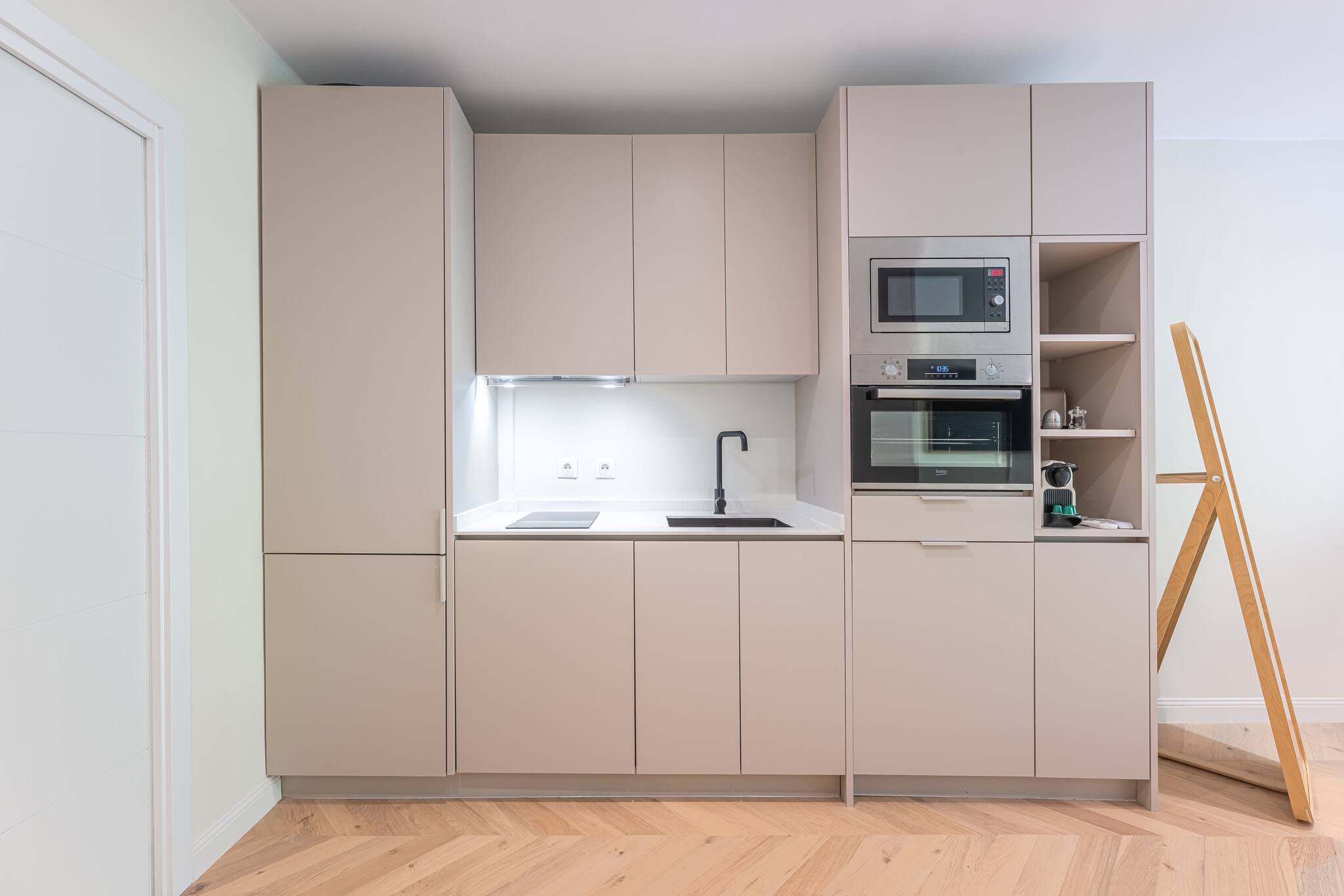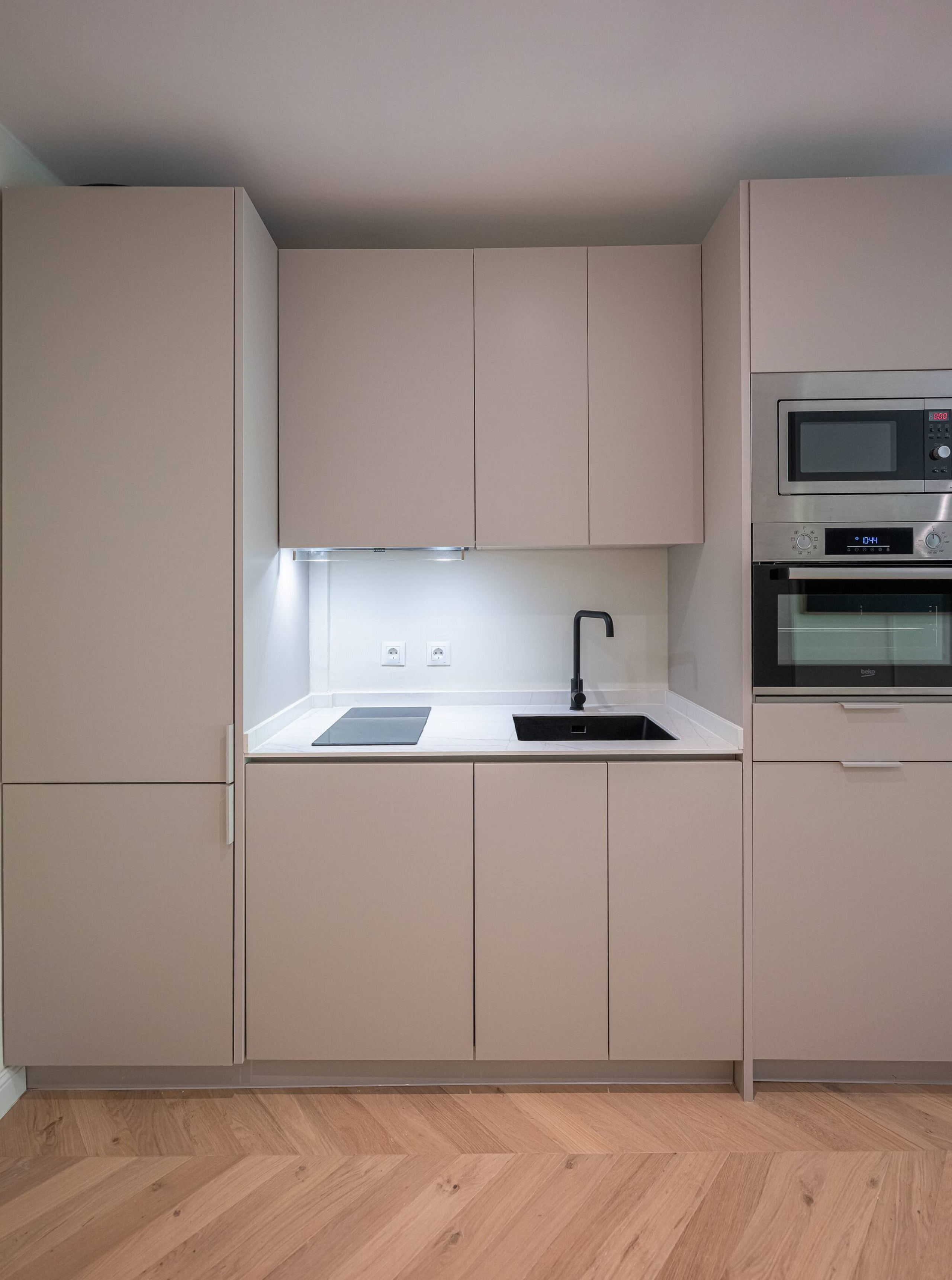 > Elegant integrated kitchen with minimalist lines and quality finishes. It has a ceramic hob, oven, microwave and ample storage space, designed for practicality without compromising on design.