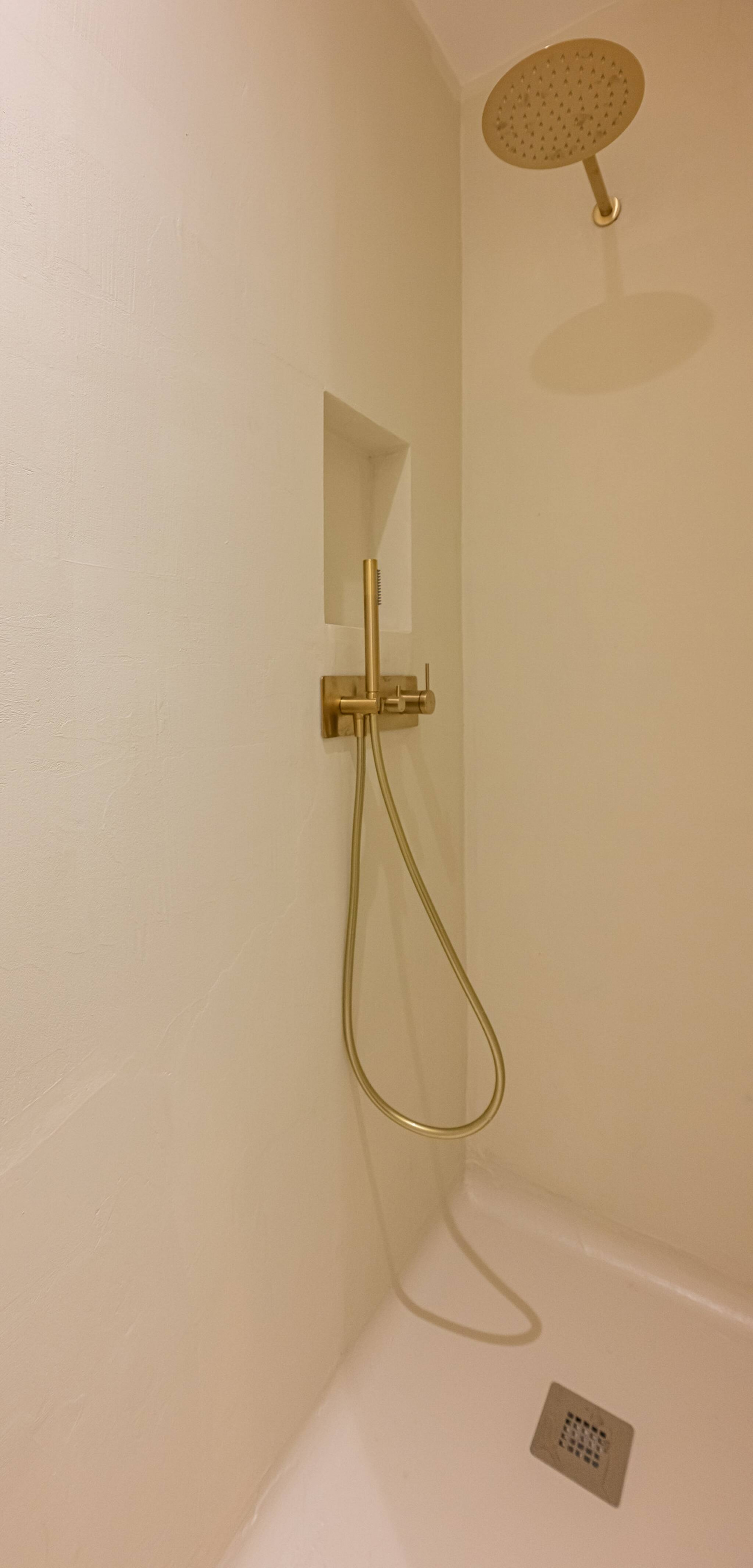> This bathroom combines neutral-toned walls with gold finishes and warm wood, achieving a balance between modernity and comfort. Subtle lighting enhances the texture of the materials and transforms the marble shower and sink into a sophisticated corner for personal care.