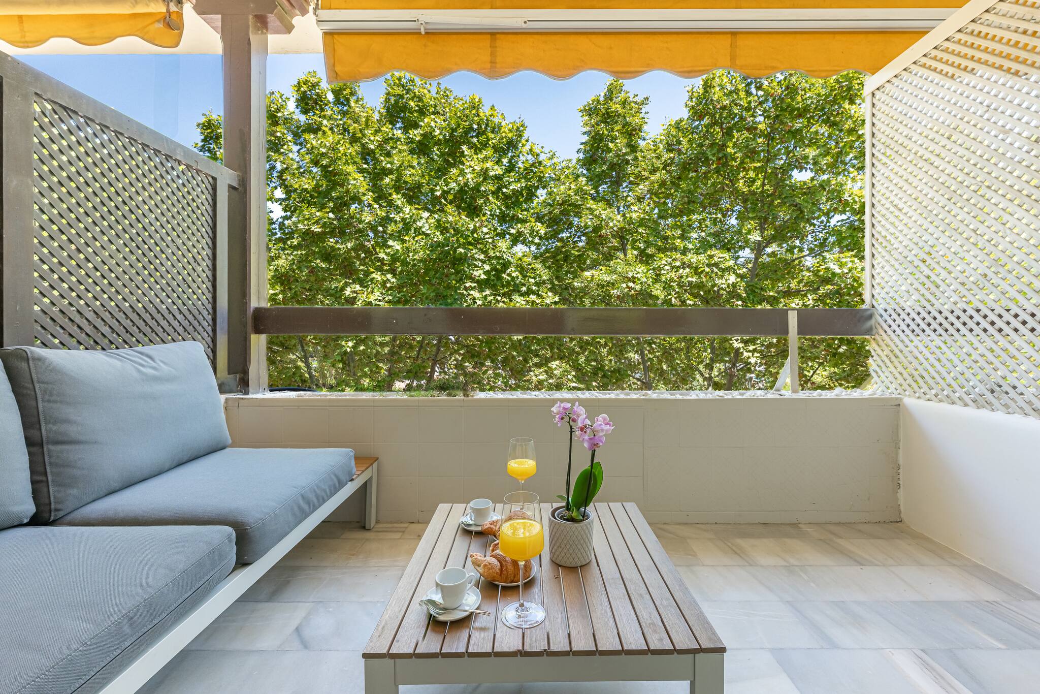> Spacious balcony surrounded by greenery, equipped with a comfortable sofa ideal for relaxing outdoors. It is the perfect space for reading, resting or enjoying the Mediterranean breeze in a peaceful setting.