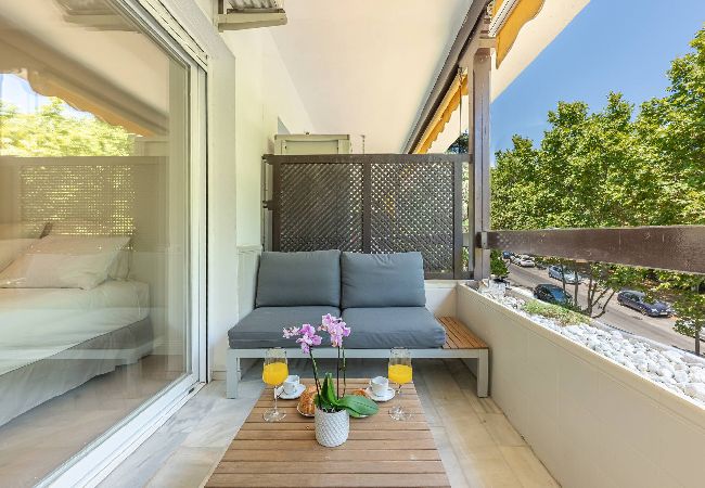 A flirtatious studio in Nueva Andalucía (Aries Street) is the perfect refuge for families, combining a modern open-concept design with exceptional warmth. With capacity for 4 people, the space stands out for its luminosity and Nordic and Mediterranean aesthetic, with finishes in cream tones and wood that invite relaxation.