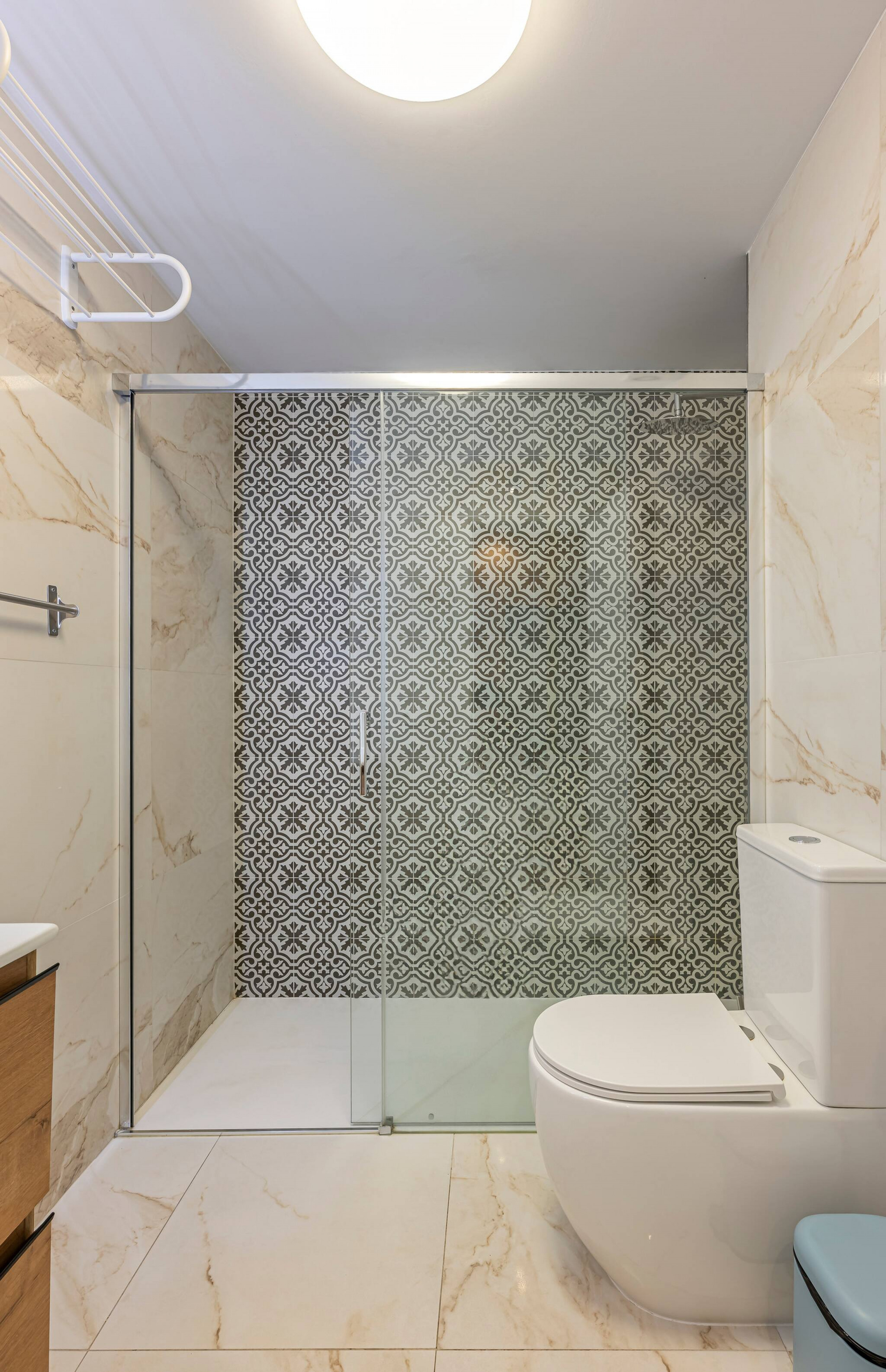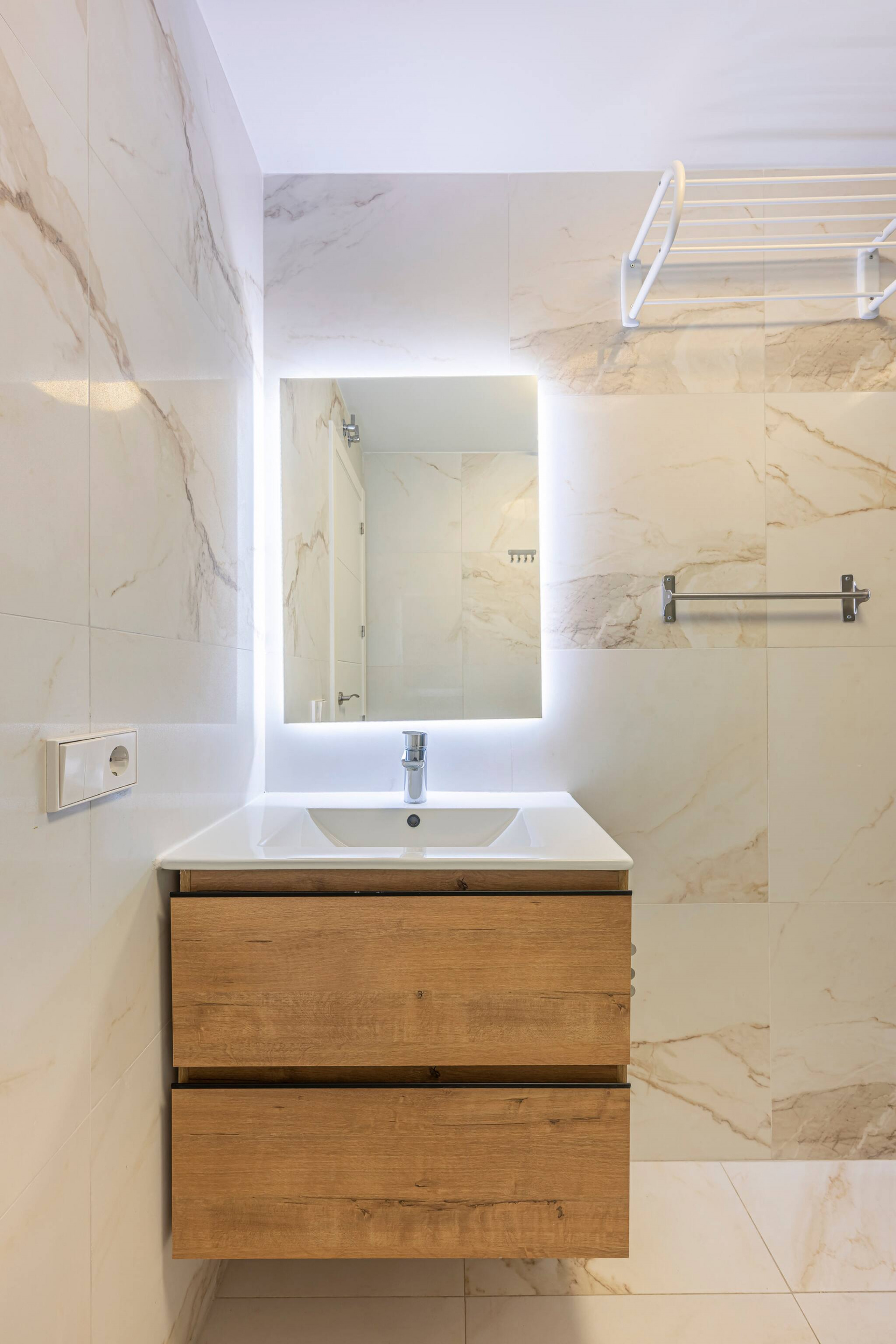 > This bathroom combines neutral-toned walls with gold finishes and warm wood, achieving a balance between modernity and comfort. Subtle lighting enhances the texture of the materials and transforms the marble shower and sink into a sophisticated corner for personal care.