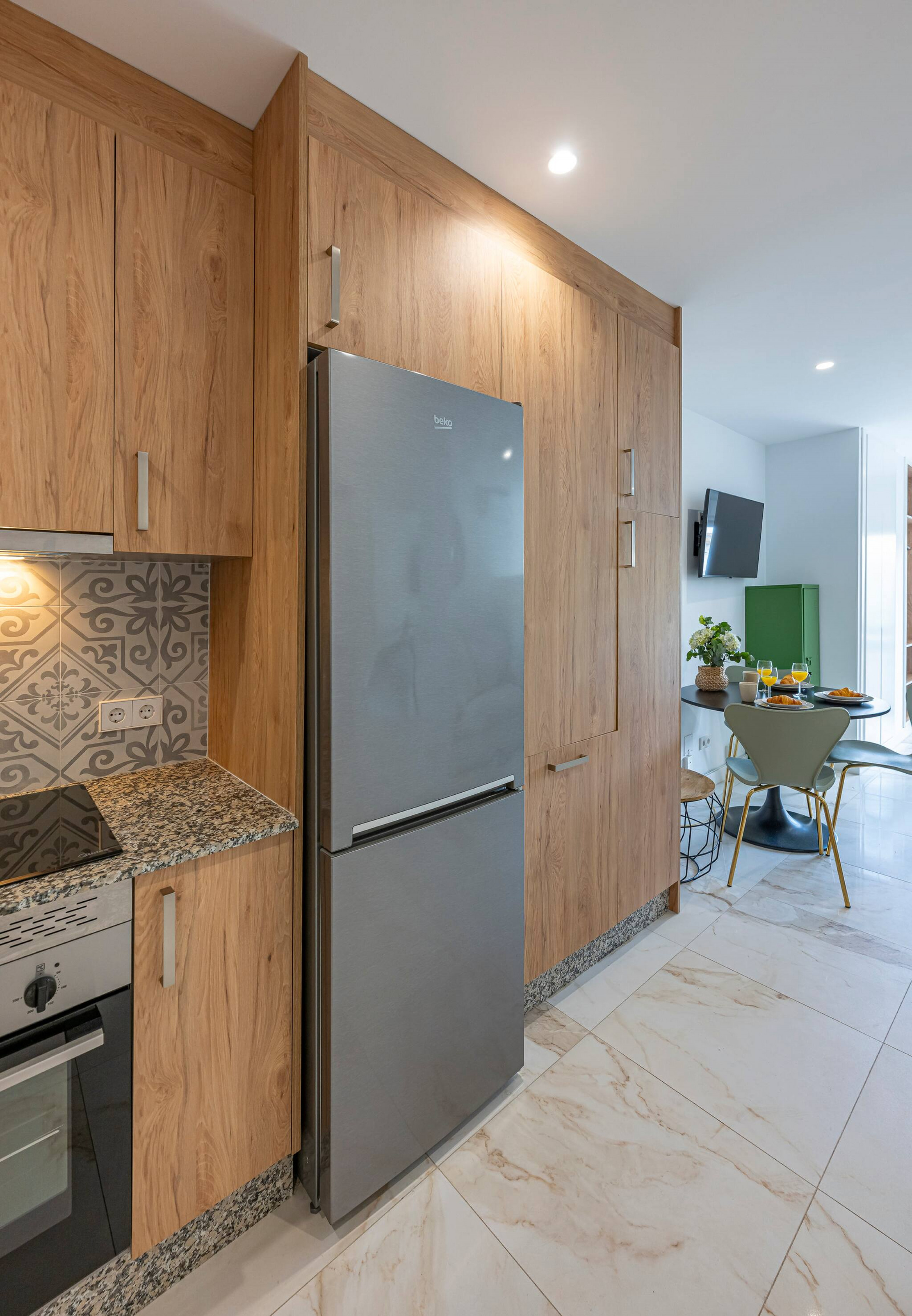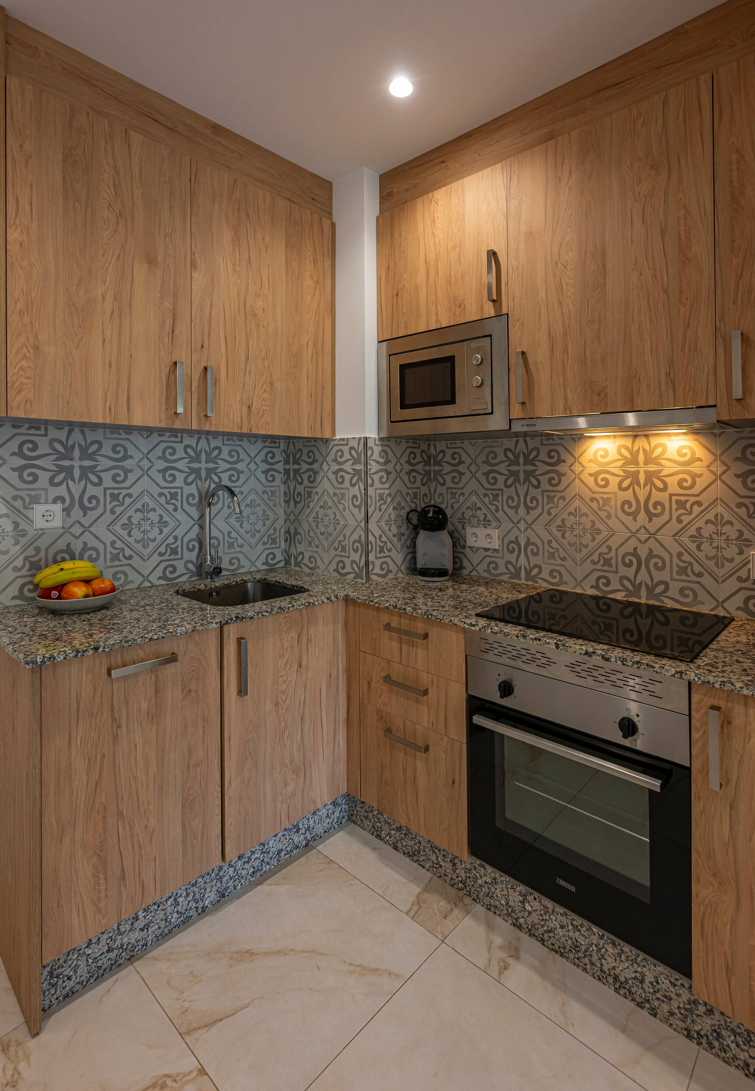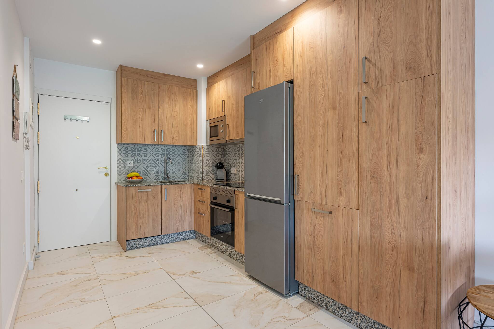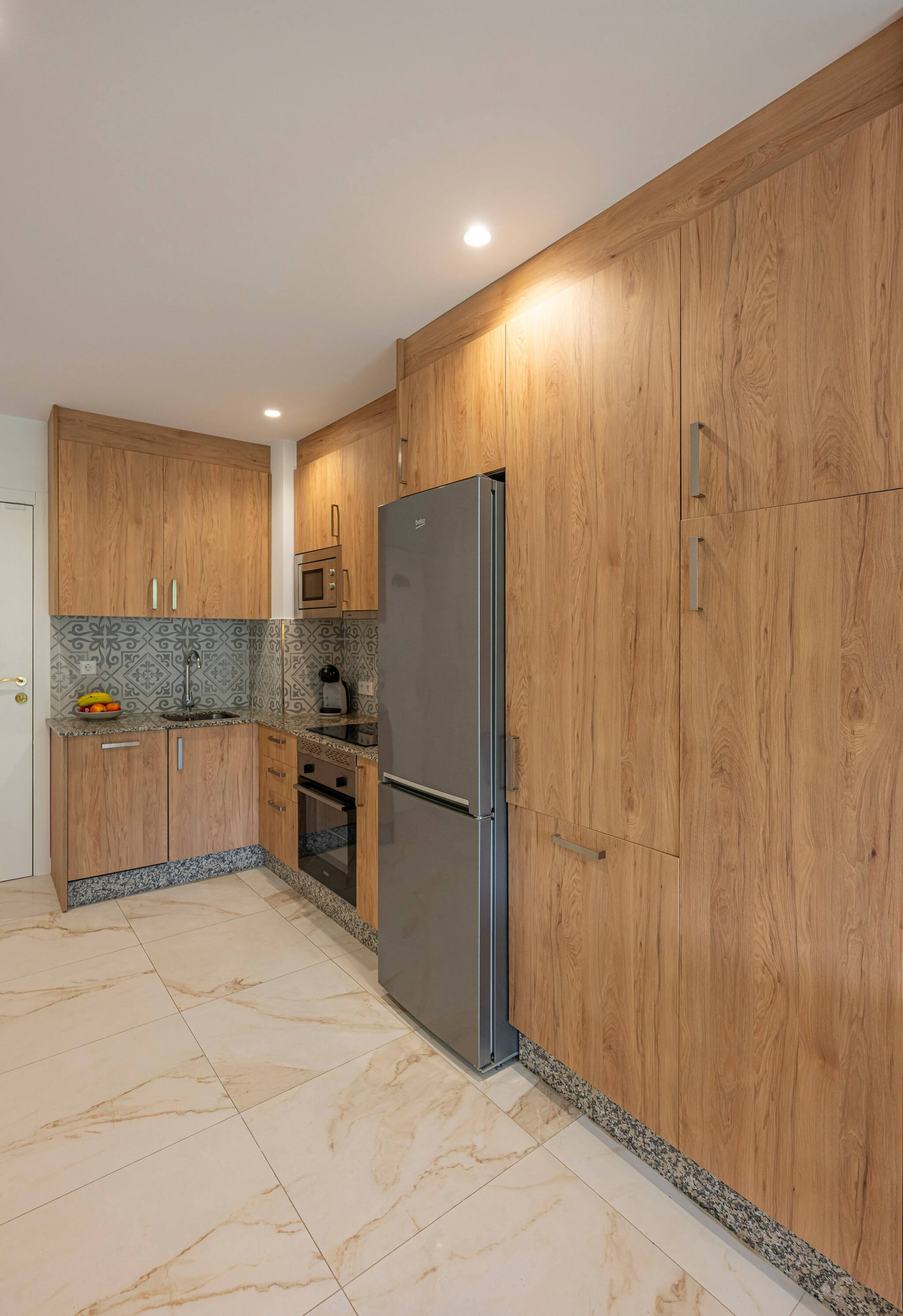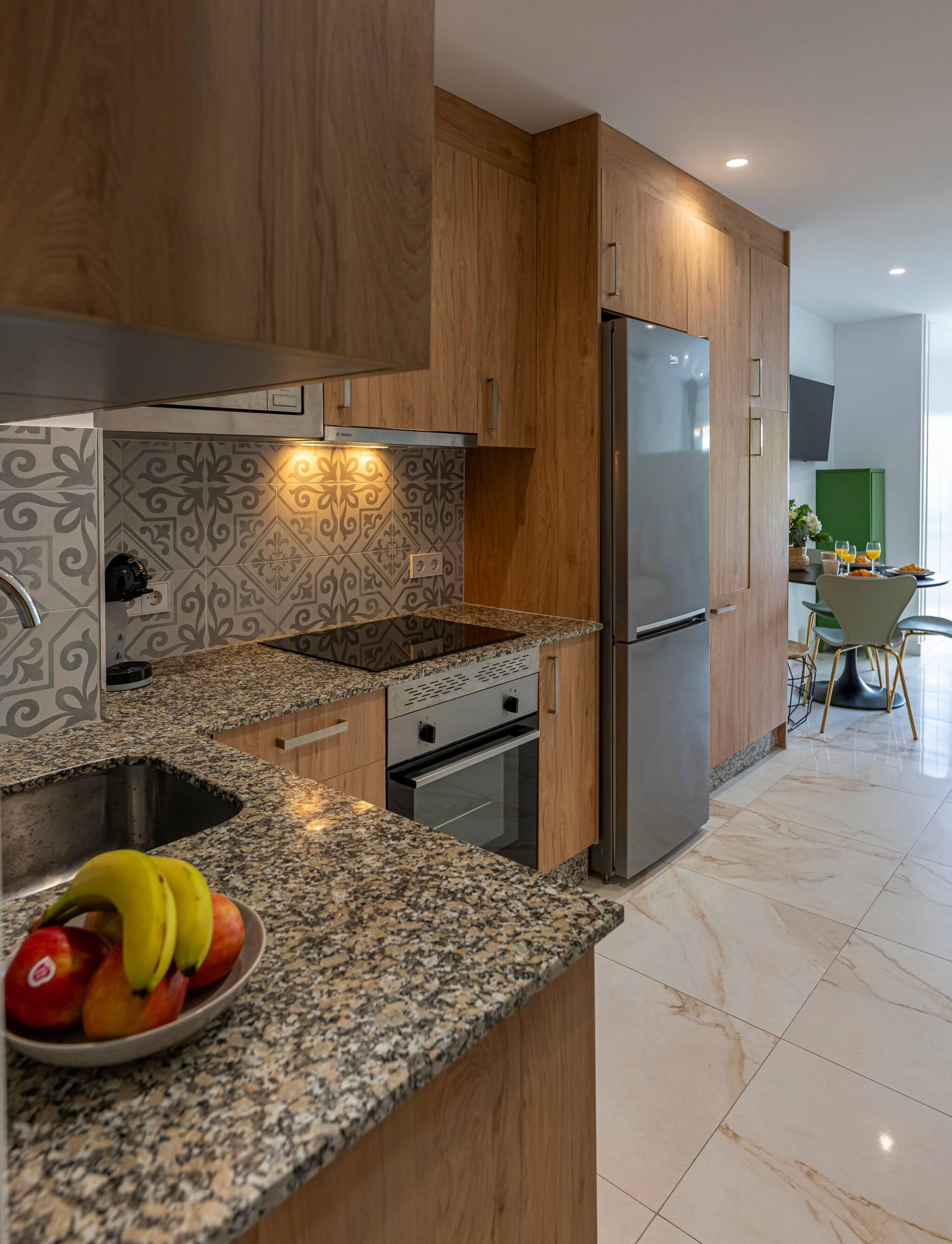 > Elegant integrated kitchen with minimalist lines and quality finishes. It has a ceramic hob, oven, microwave and ample storage space, designed for practicality without compromising on design.