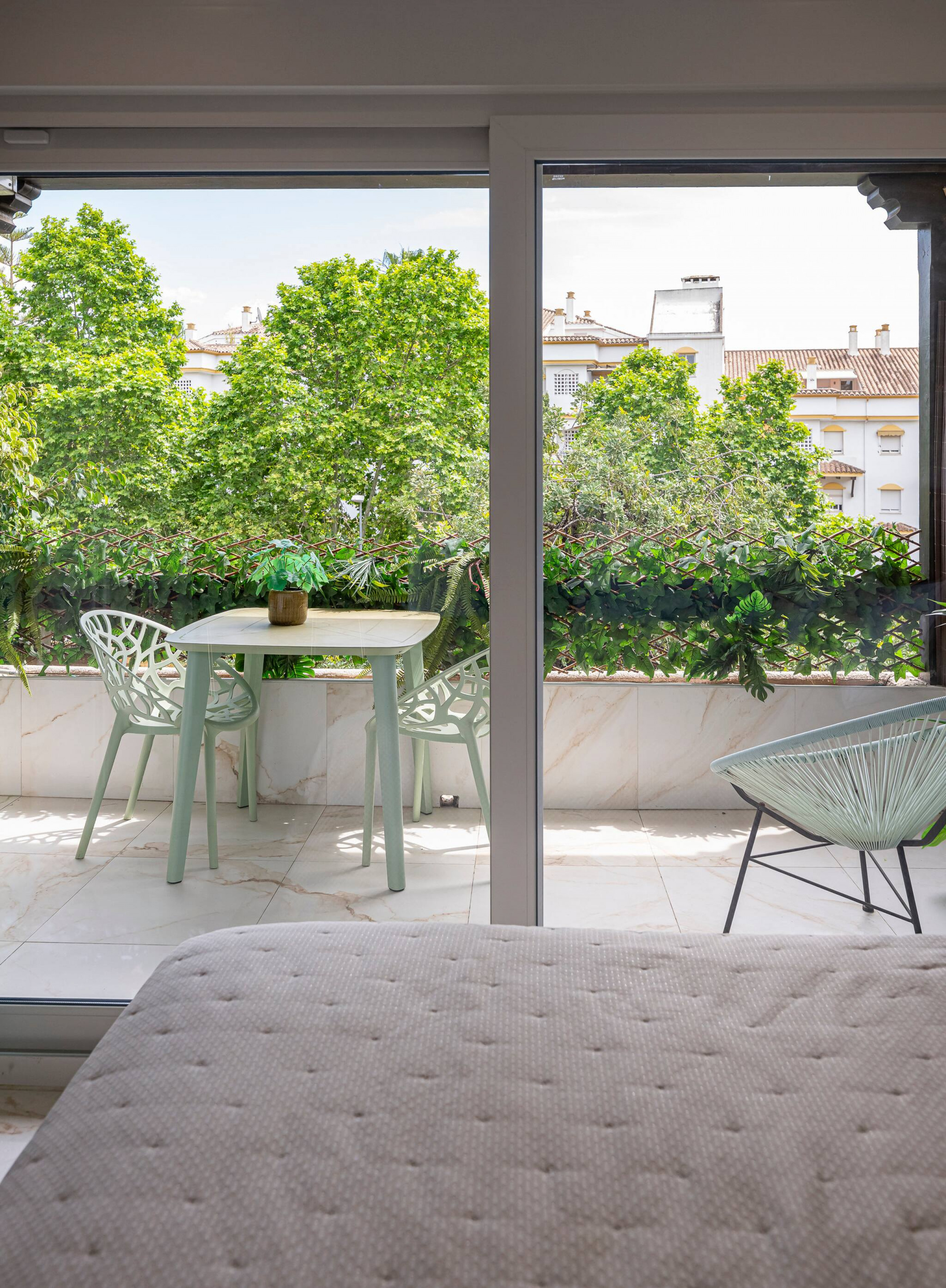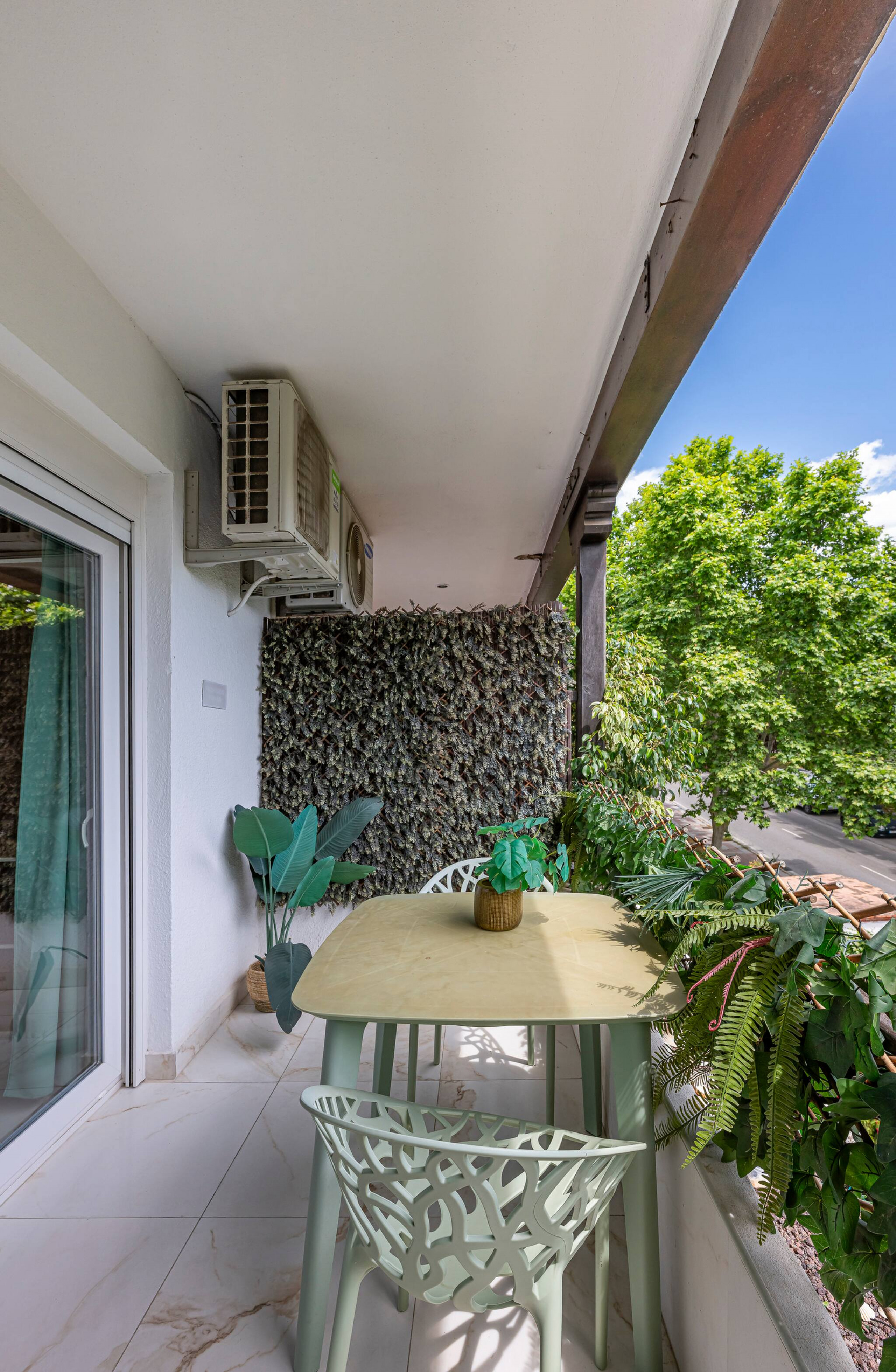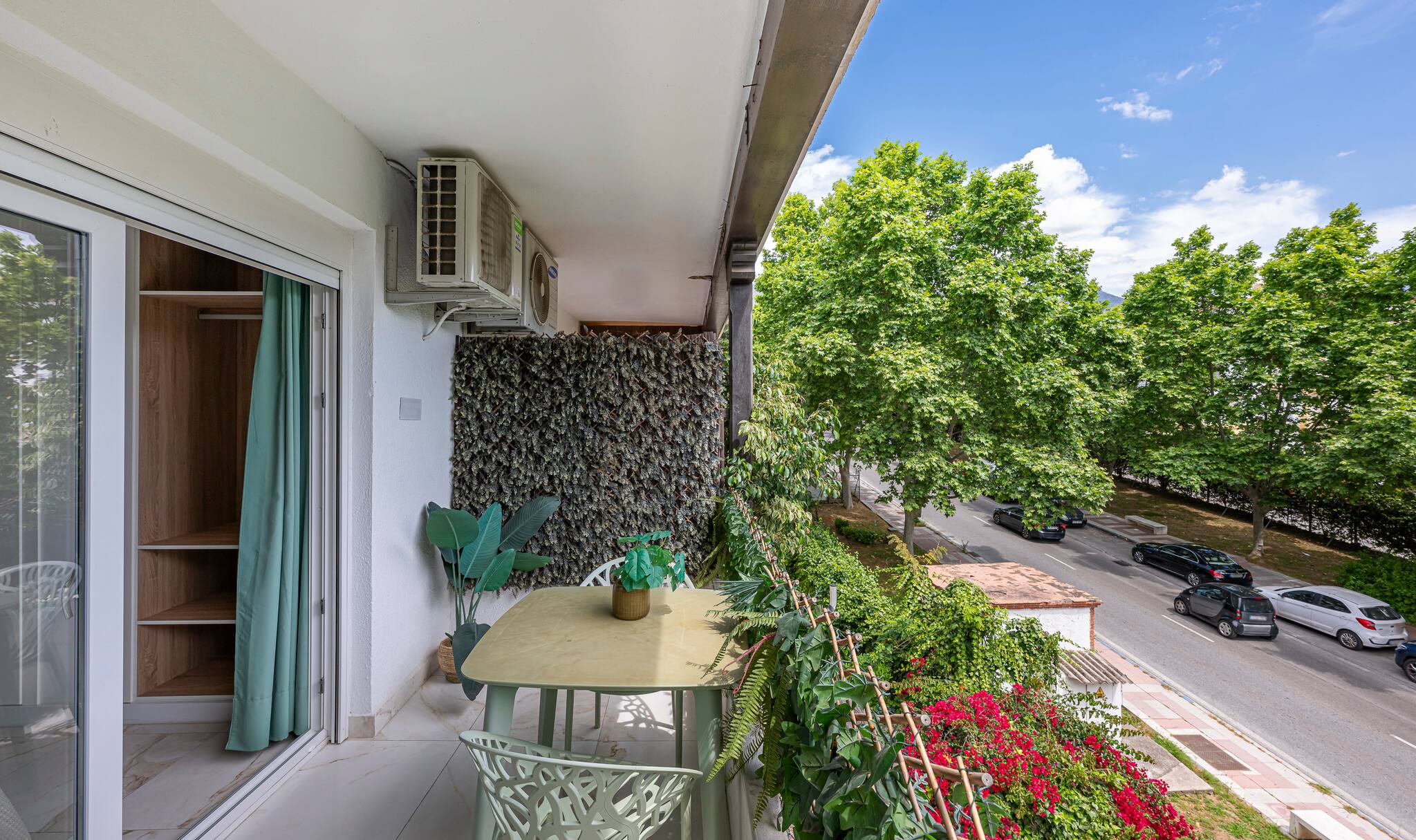 > Spacious balcony surrounded by greenery, equipped with a comfortable sofa ideal for relaxing outdoors. It is the perfect space for reading, resting or enjoying the Mediterranean breeze in a peaceful setting.