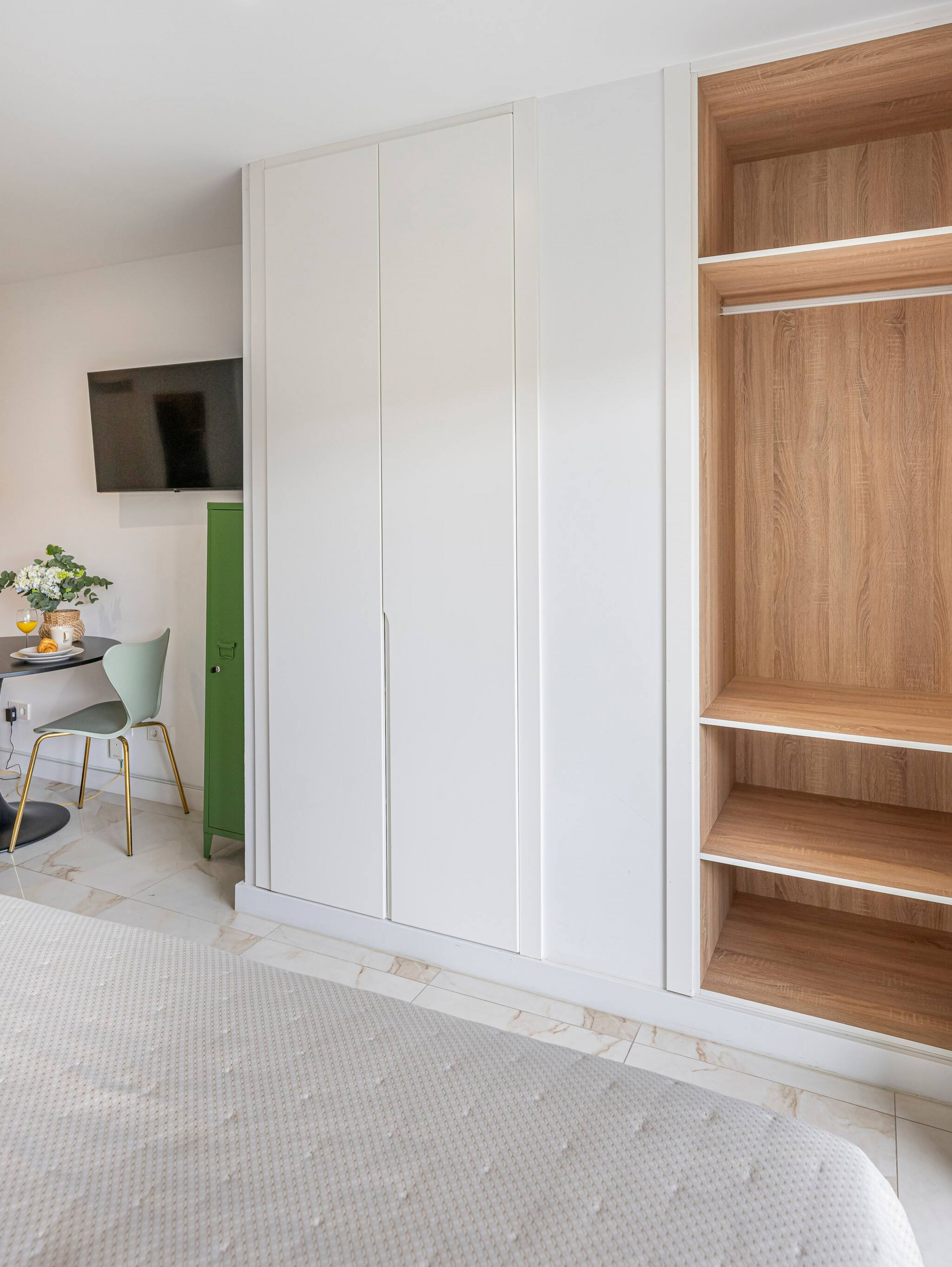 > Cosy bedroom with a 135 cm double bed, designed to provide comfort and tranquillity. It has a mirror and a TV for moments of relaxation. Its large windows offer direct access to the balcony and fill the room with natural light throughout the day.