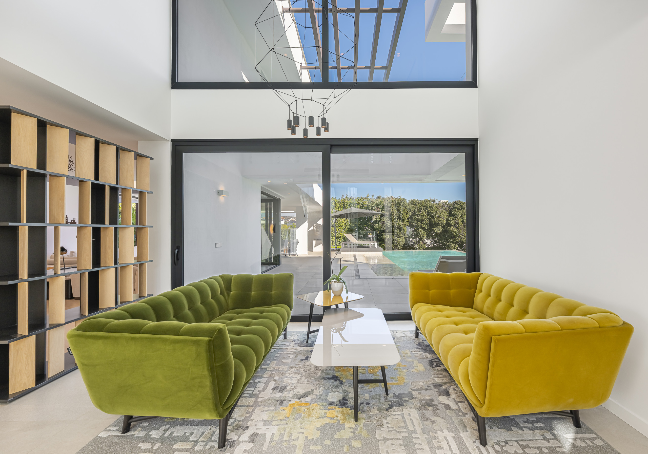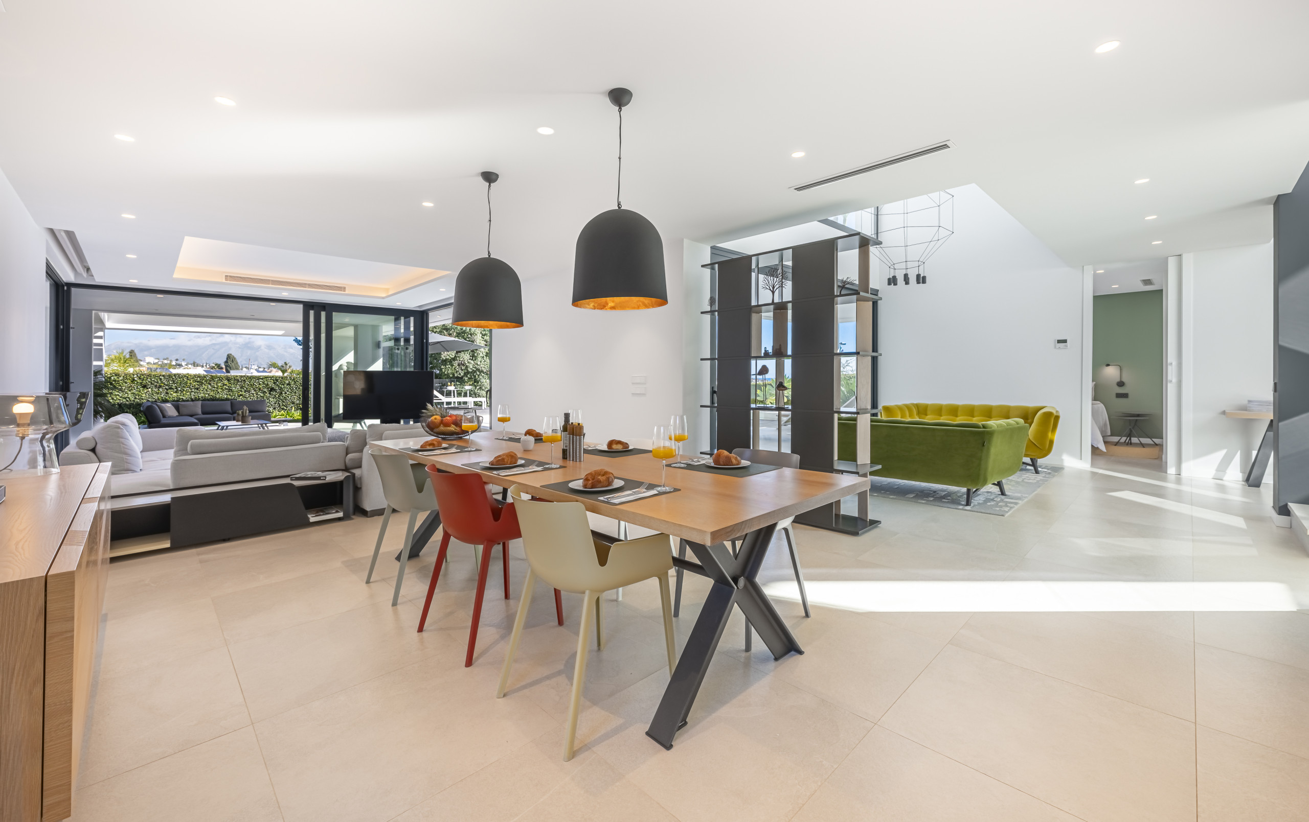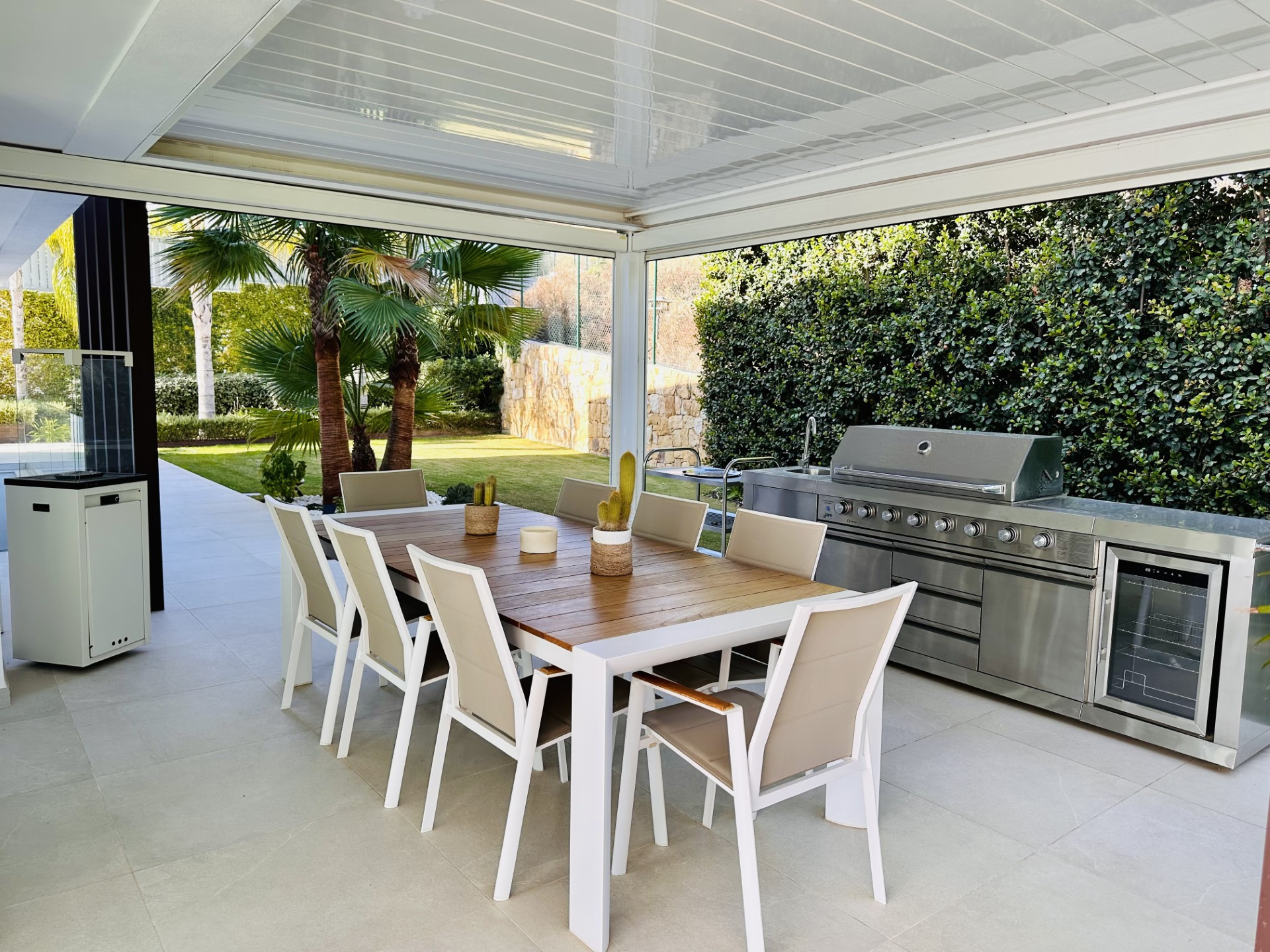 A spacious and bright social centre with high ceilings, contemporary decor and a large Smart TV. The living area opens directly onto the well-maintained garden and pool area through enormous glass doors, creating a perfect connection with the outdoors.