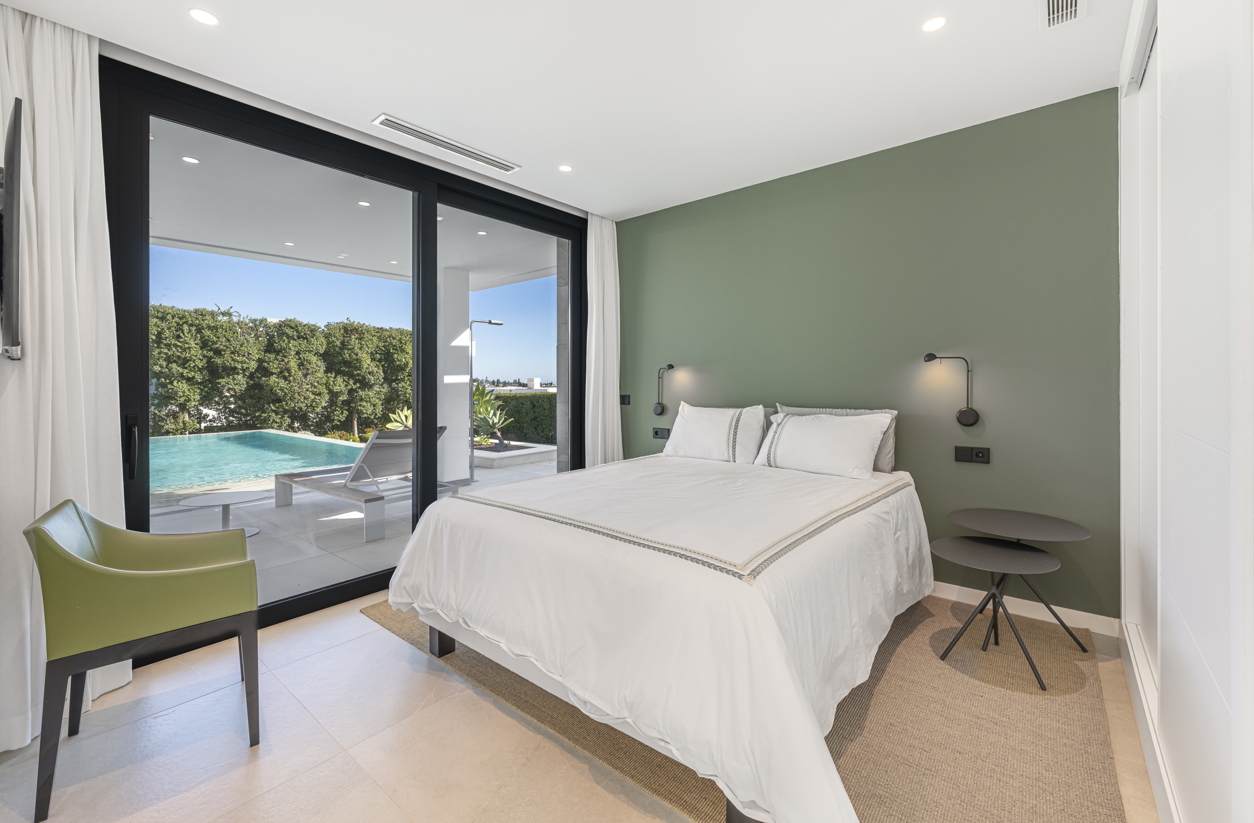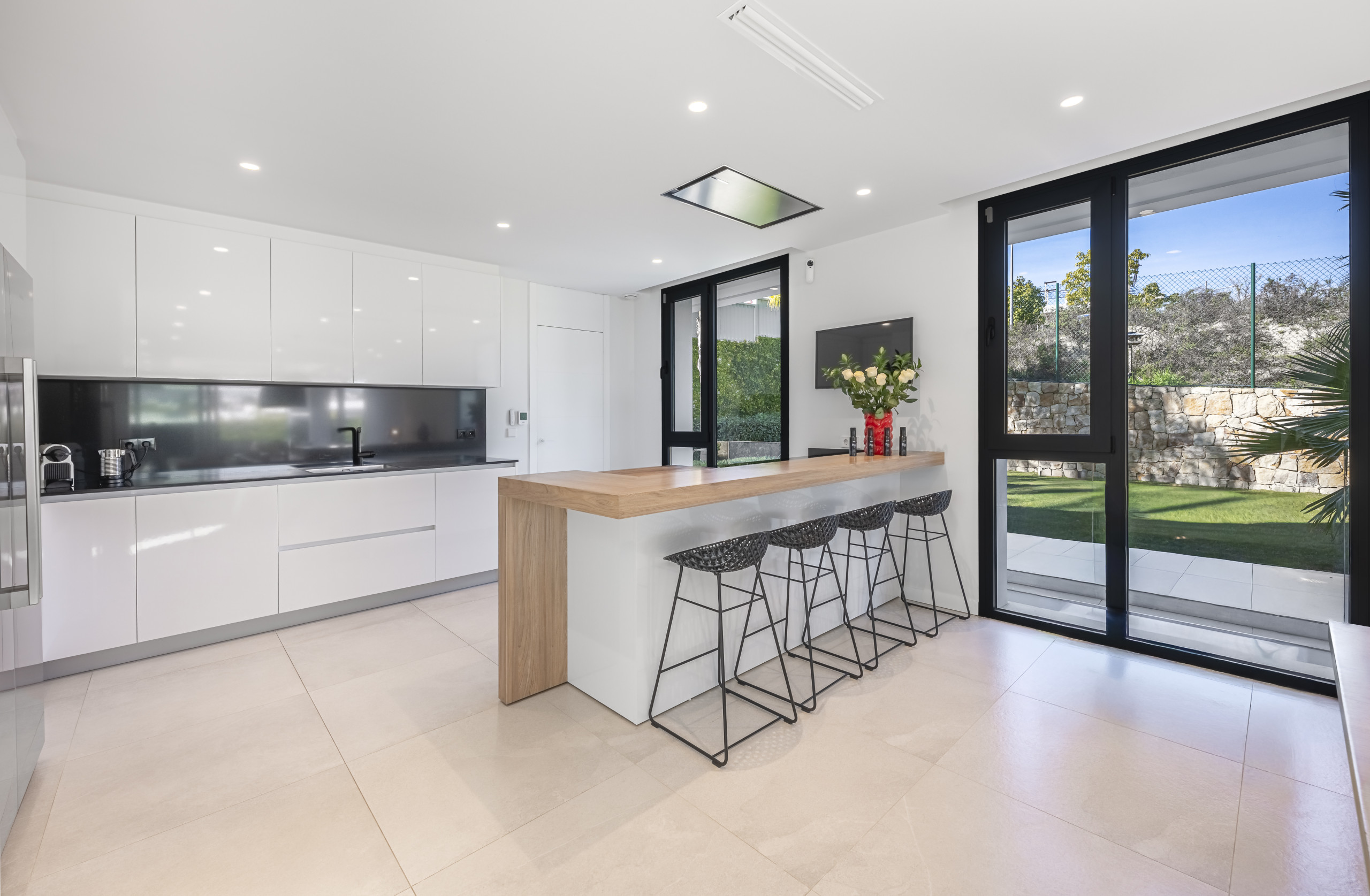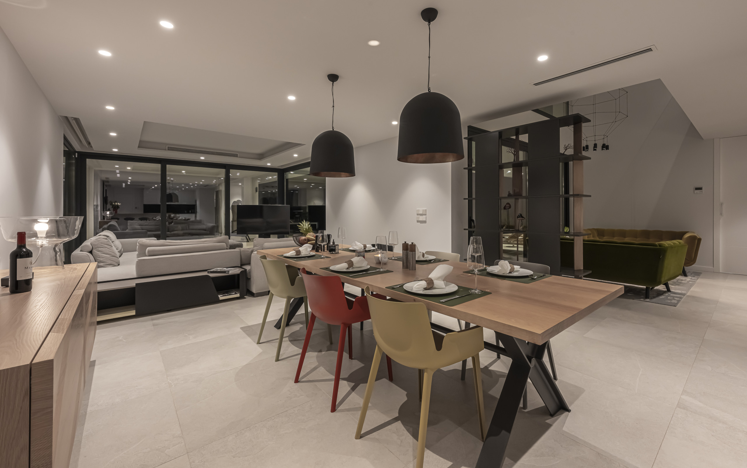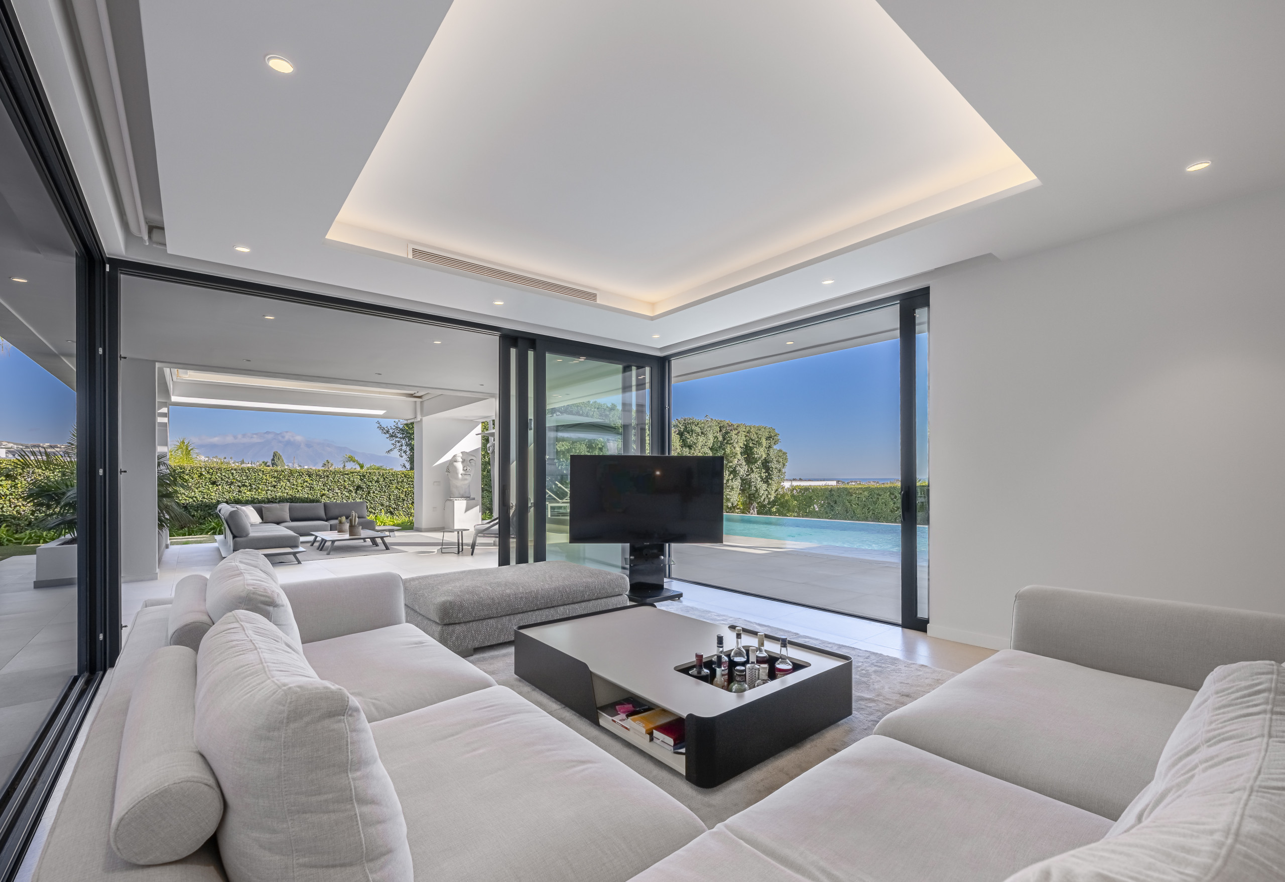 A spacious and bright social centre with high ceilings, contemporary decor and a large Smart TV. The living area opens directly onto the well-maintained garden and pool area through enormous glass doors, creating a perfect connection with the outdoors.