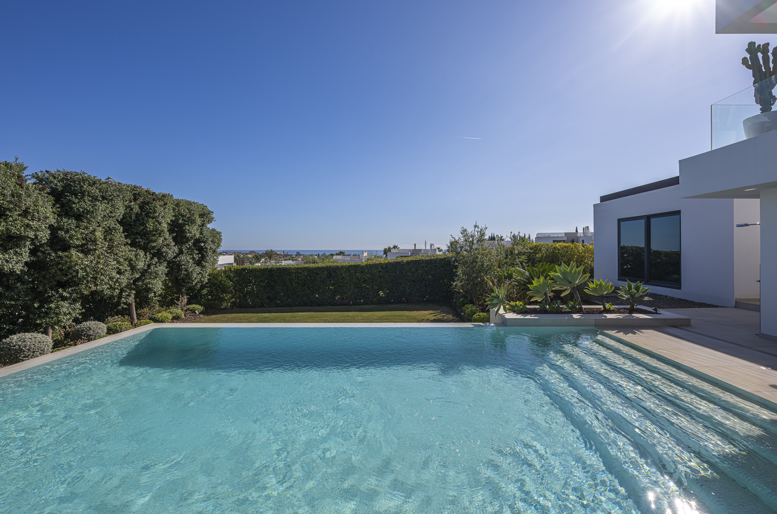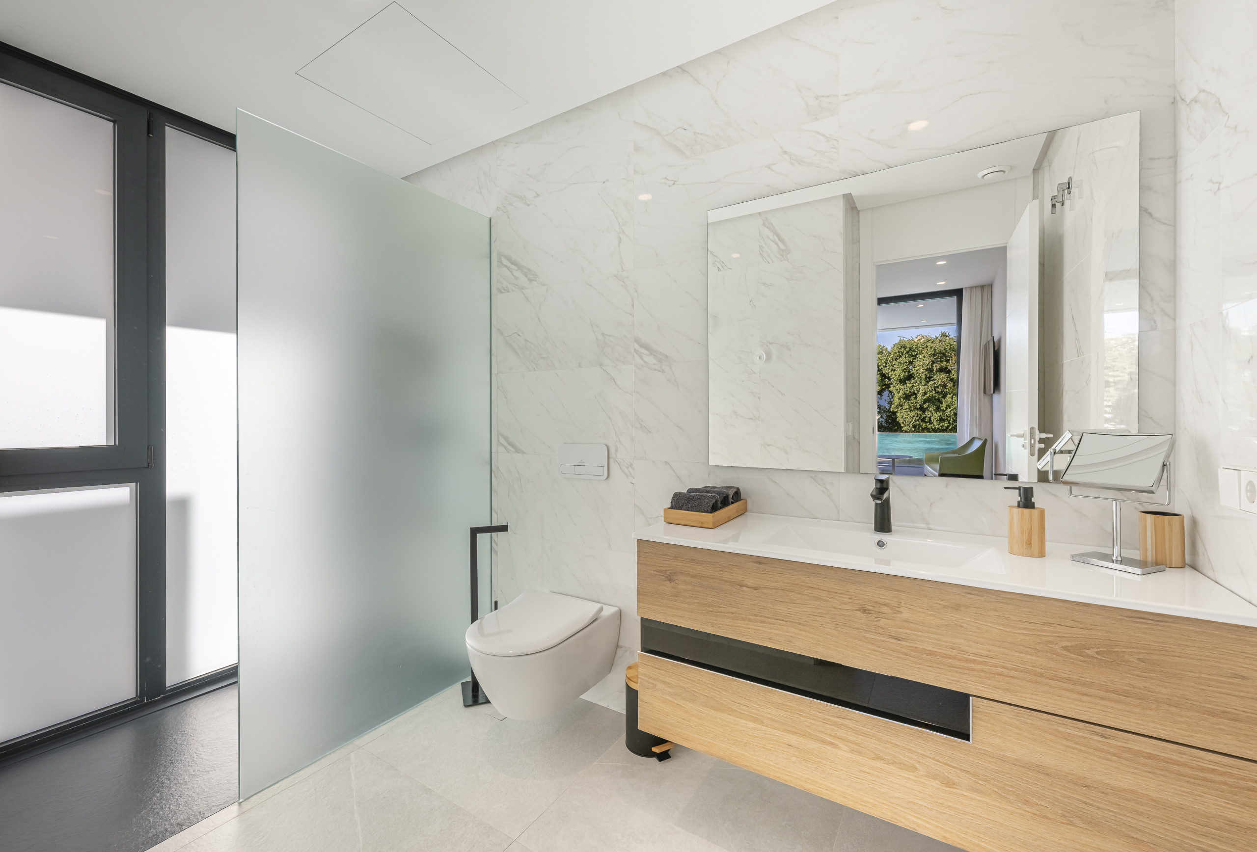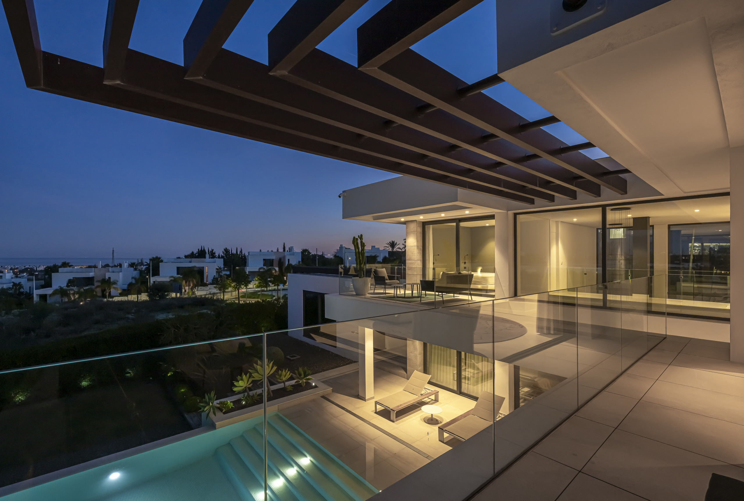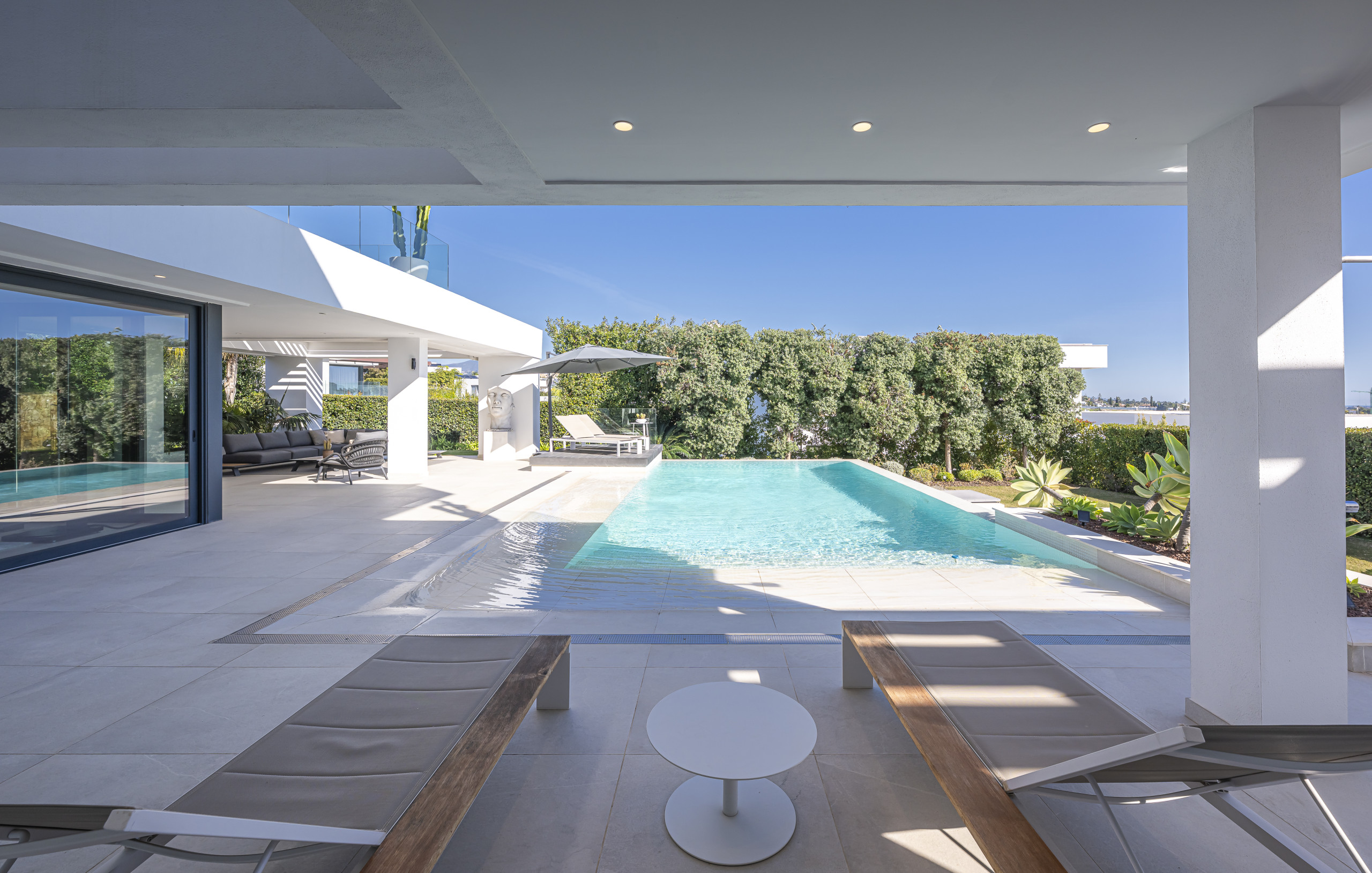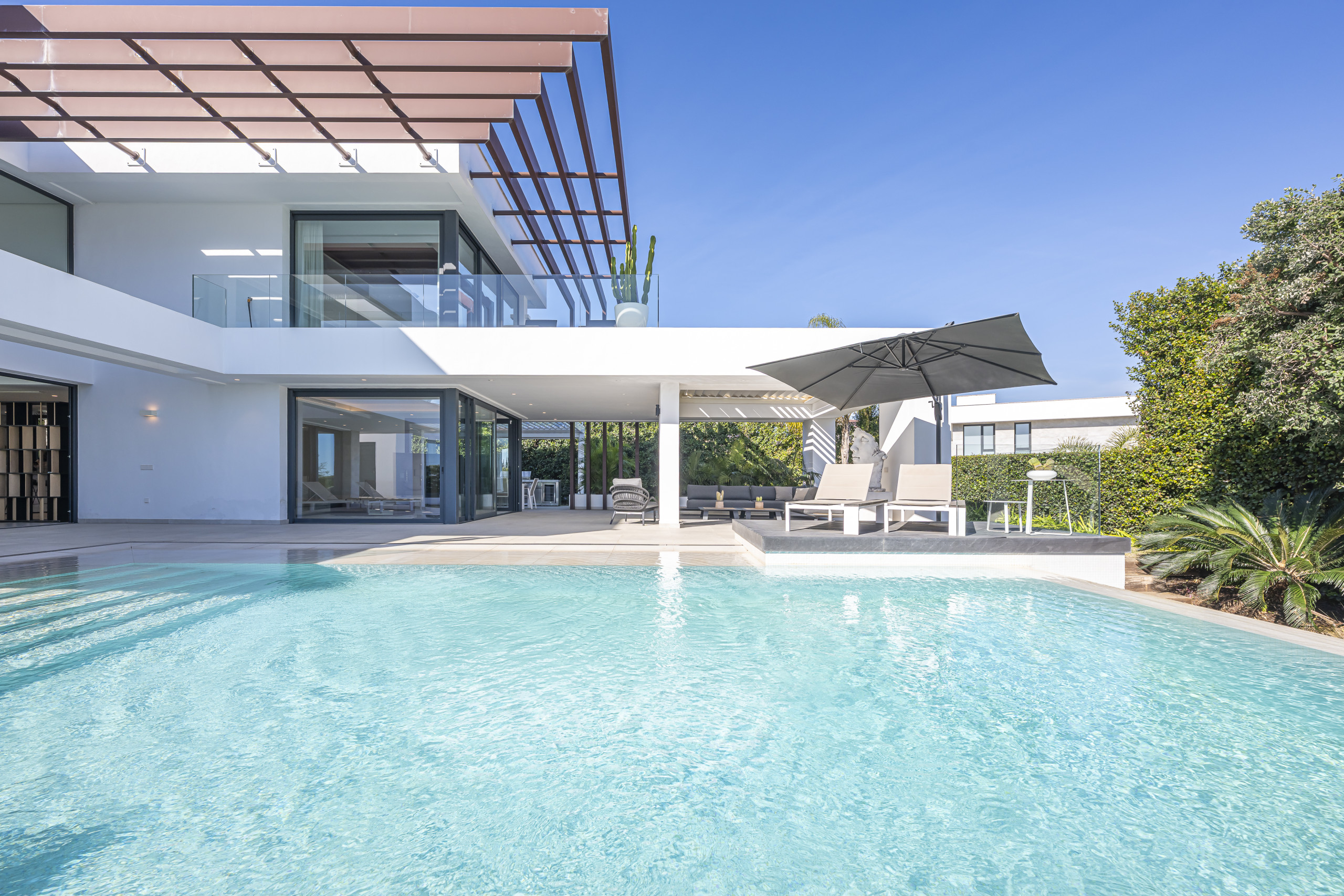 The exterior area is designed for total relaxation. Enjoy the private pool with comfortable sun loungers, a lush Mediterranean garden, and a refreshing outdoor shower. The motorised pergola allows you to adjust the shade with just the press of a button.