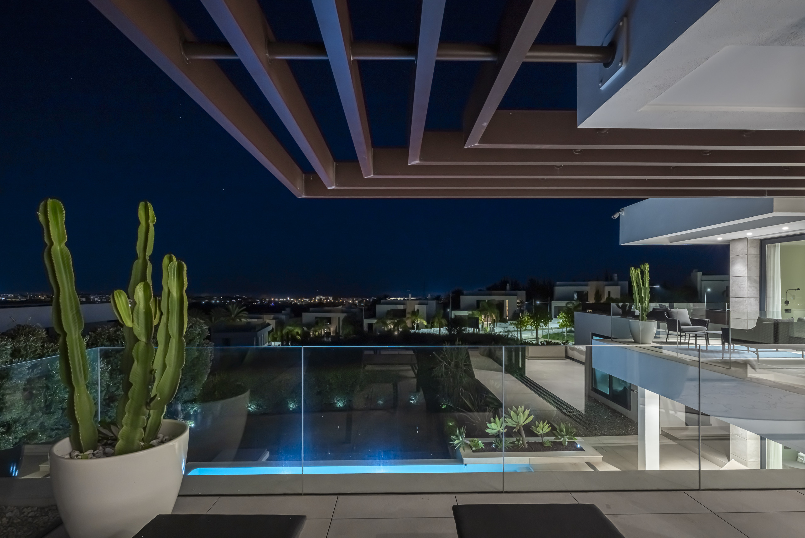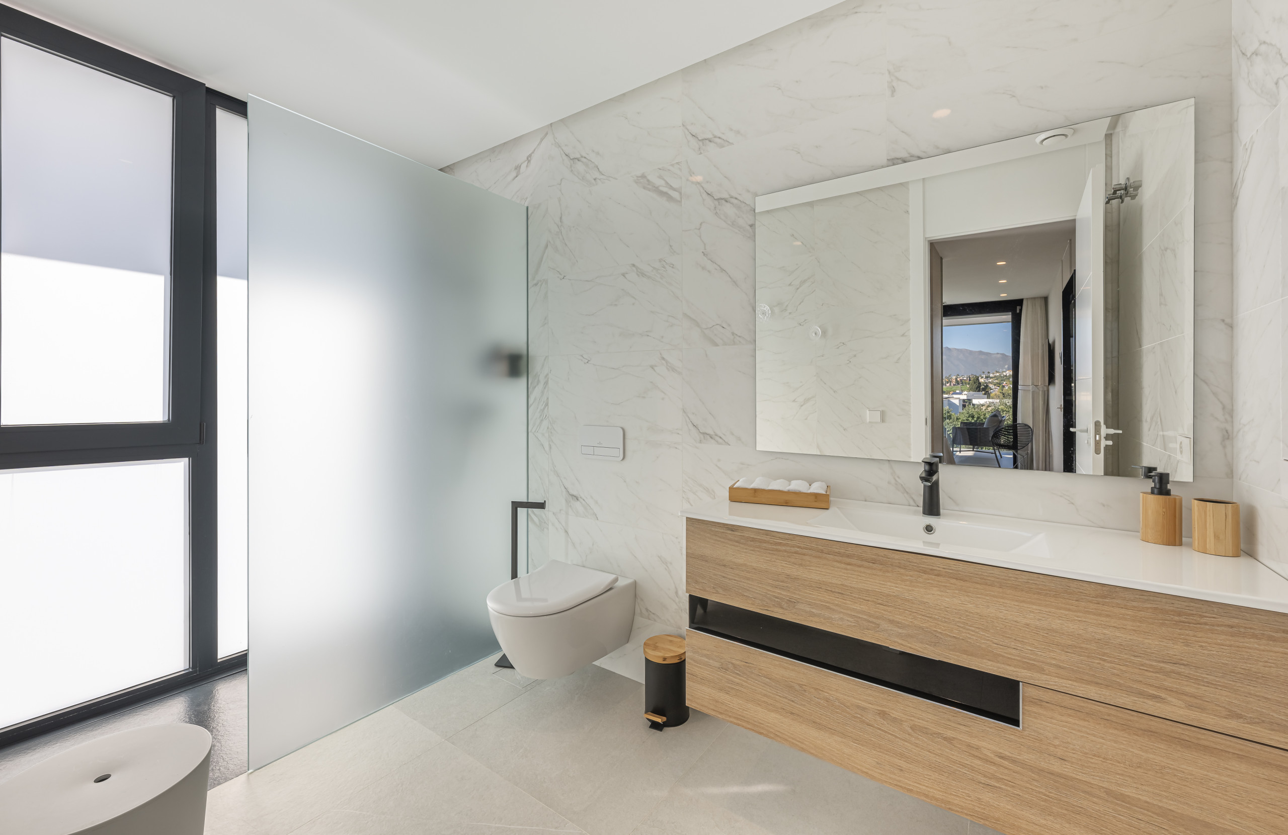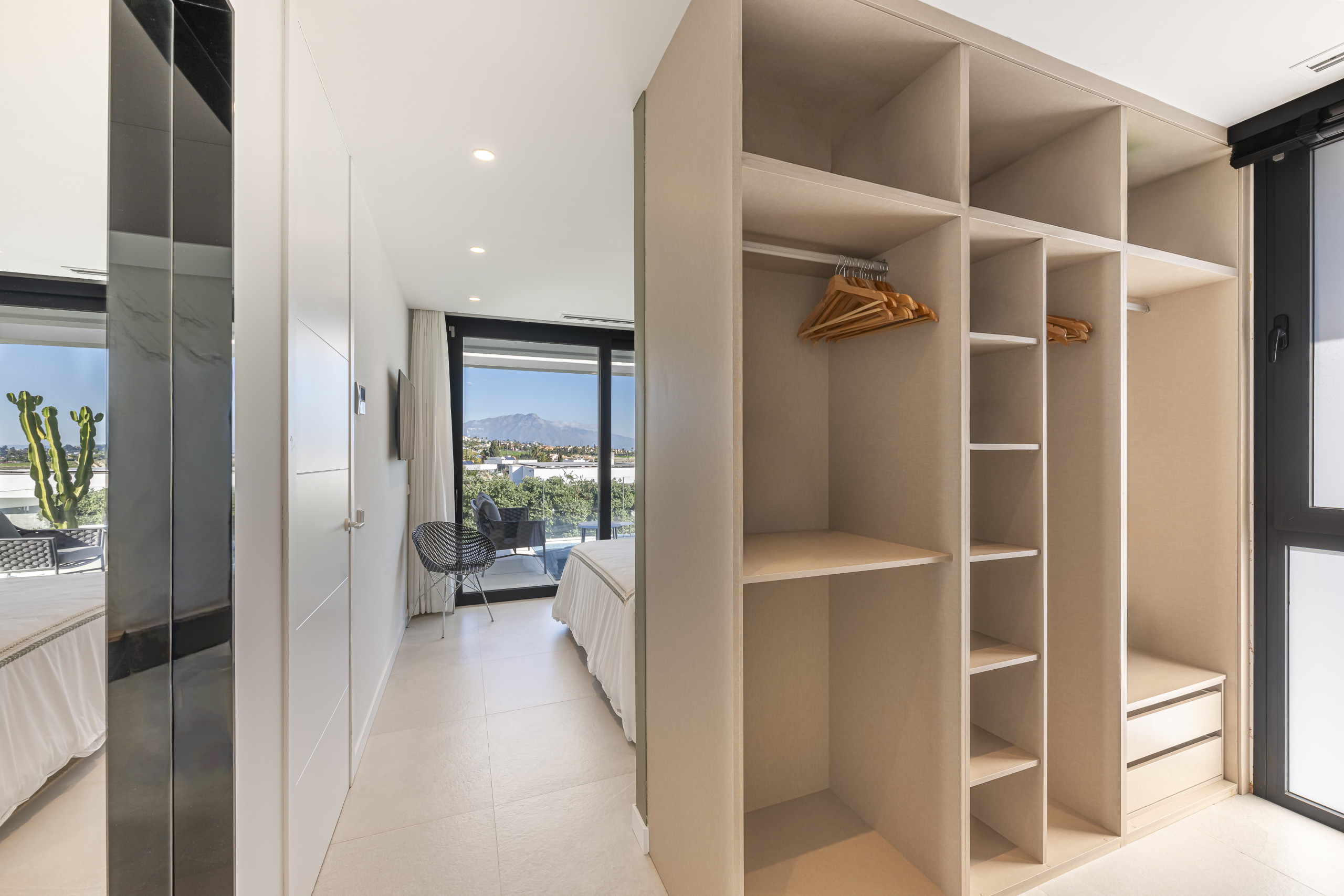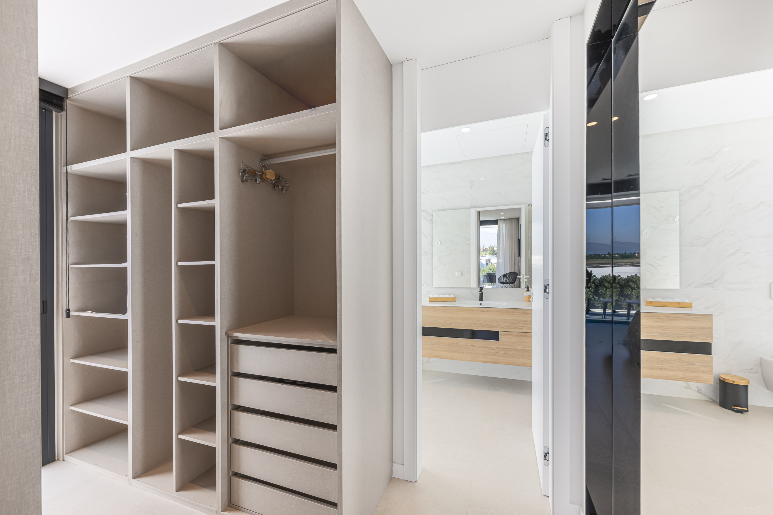 The exterior area is designed for total relaxation. Enjoy the private pool with comfortable sun loungers, a lush Mediterranean garden, and a refreshing outdoor shower. The motorised pergola allows you to adjust the shade with just the press of a button.