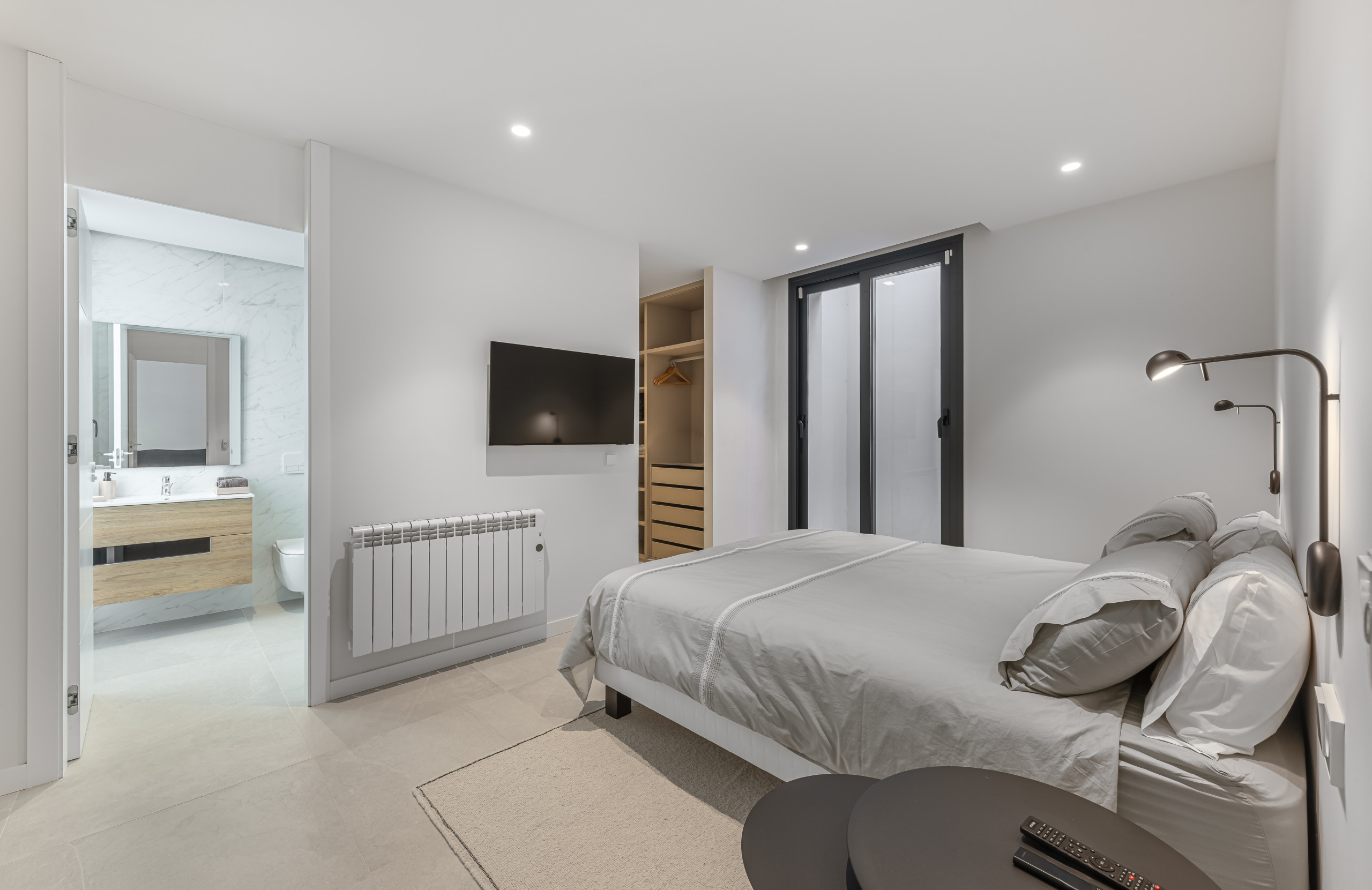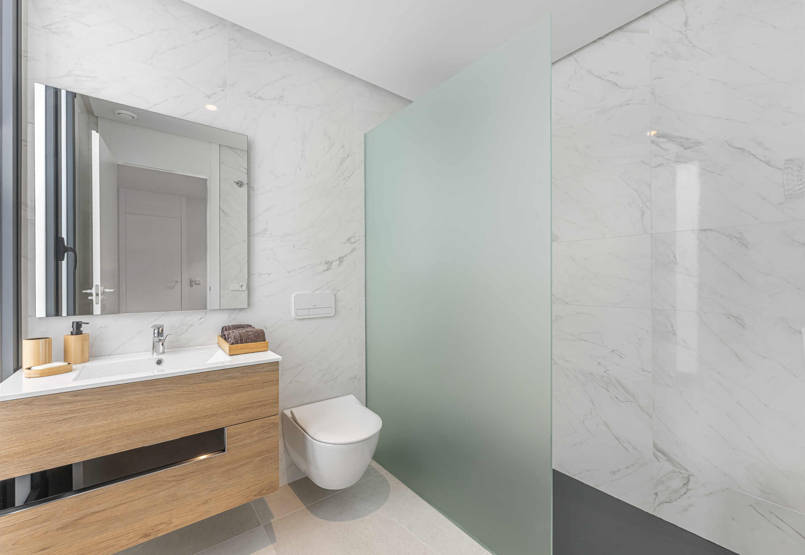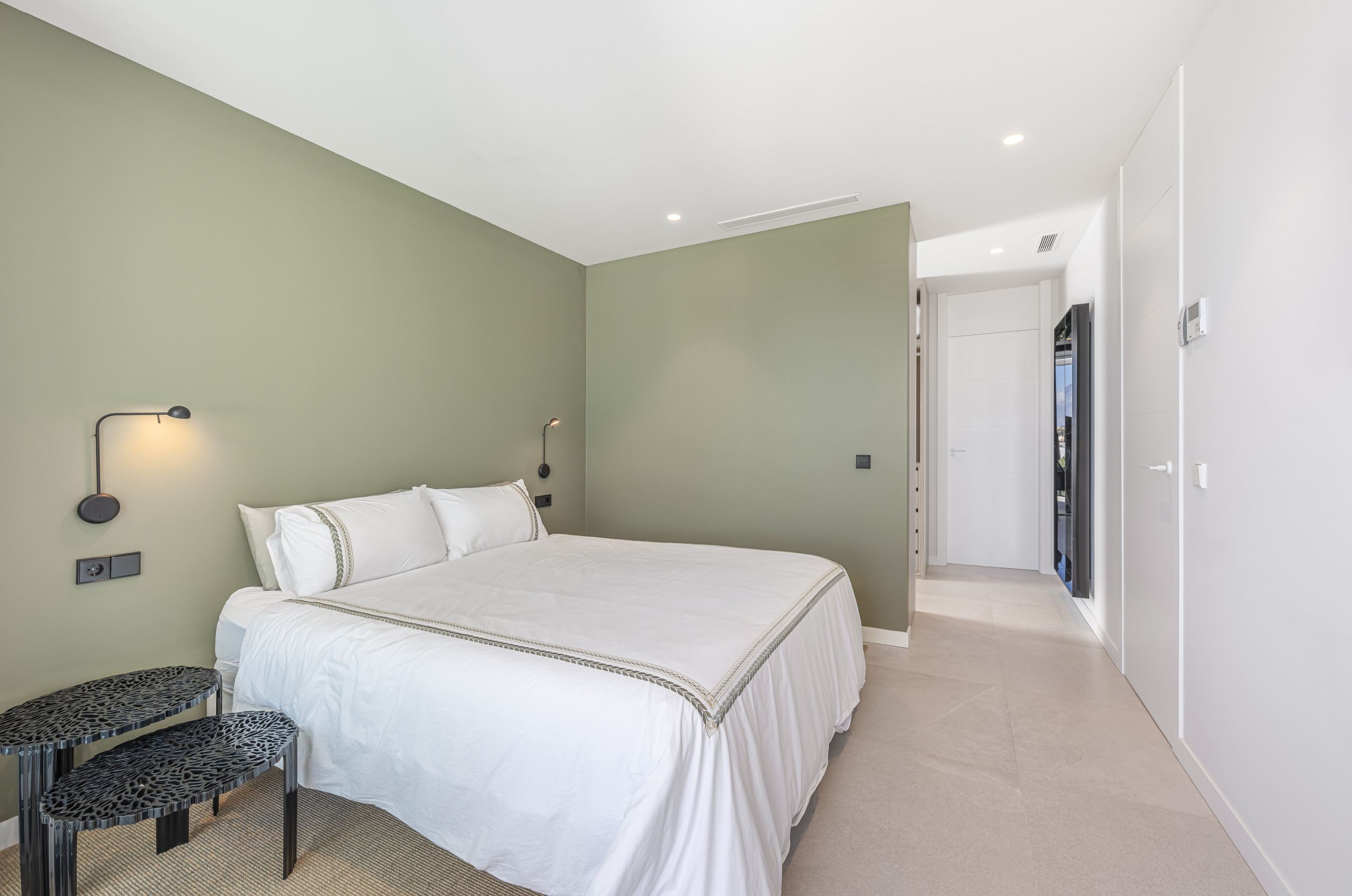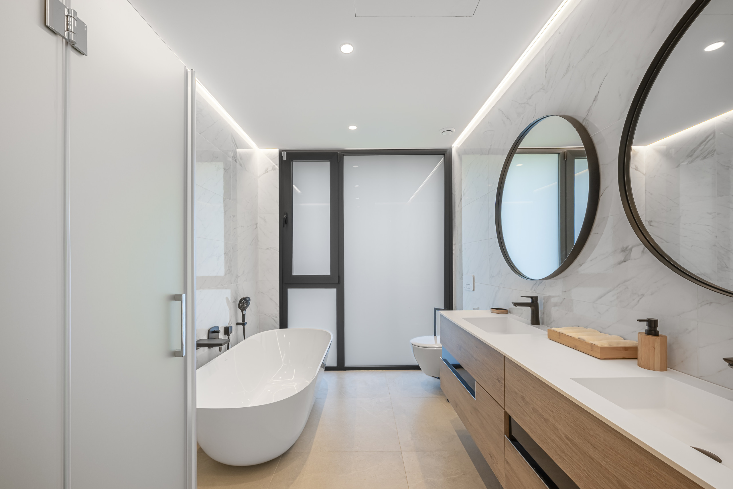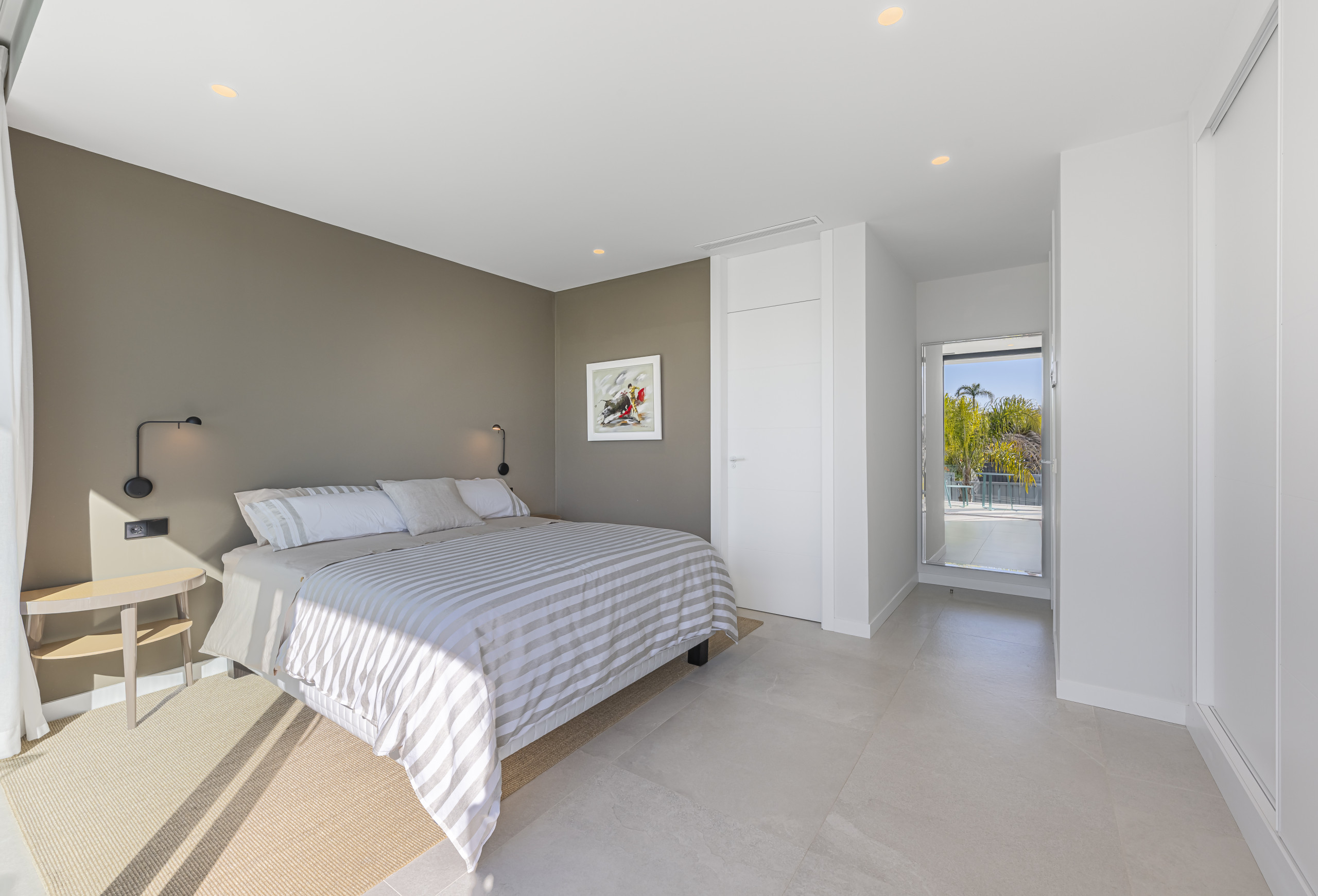 The exterior area is designed for total relaxation. Enjoy the private pool with comfortable sun loungers, a lush Mediterranean garden, and a refreshing outdoor shower. The motorised pergola allows you to adjust the shade with just the press of a button.